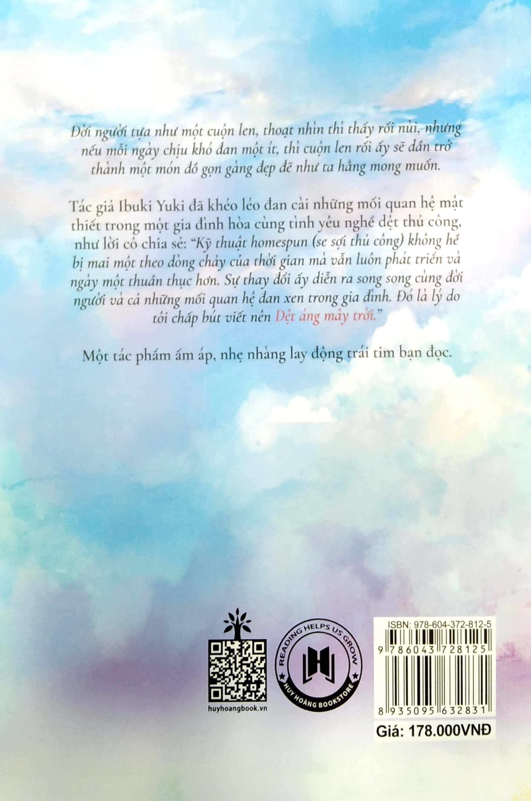 Tác giả Ibuki Yuki đã khéo léo đan cài những mối quan hệ mật thiết trong một gia đình hòa cùng tình yêu nghề dệt thủ công, như lời cô chia sẻ: “Kỹ thuật homespun (se sợi thủ công) không hề bị mai một theo dòng chảy của thời gian mà vẫn luôn phát triển và ngày một thuần thục hơn. Sự thay đổi ấy diễn ra song song cùng đời người và cả những mối quan hệ đan xen trong gia đình. Đó là lý do tôi chấp bút viết nên Dệt áng mây trời.”