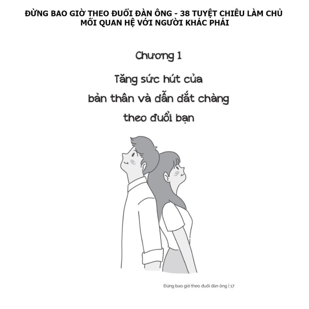 Cuốn sách Đừng bao giờ theo đuổi đàn ông được chia làm 4 chương là sự đúc kết của 38 Tuyệt chiêu làm chủ mối quan hệ để giữ gìn hạnh phúc của người phụ nữ, lấy làm thước đo là sự tử tế của người đàn ông.