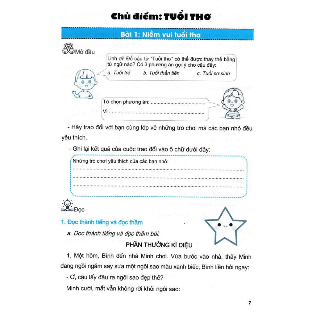 Bộ sách gồm 2 tập dùng cho 2 học kì. Học sinh có thể làm bài tập trực tiếp vào sách để giảm thiểu thời gian học. Dưới sự hỗ trợ, hướng dẫn của các thầy cô giáo, các vị phụ huynh, học sinh có thể hoàn thành từng hoạt động trên lớp hoặc ngoài giờ học một cách linh hoạt để từng bước nâng cao năng lực tiếng Việt của mình cho dù các em đang học theo sách Tiếng Việt 3 của bộ sách Cánh Diều hay Chân trời sáng tạo hay Kết nối tri thức với cuộc sống.