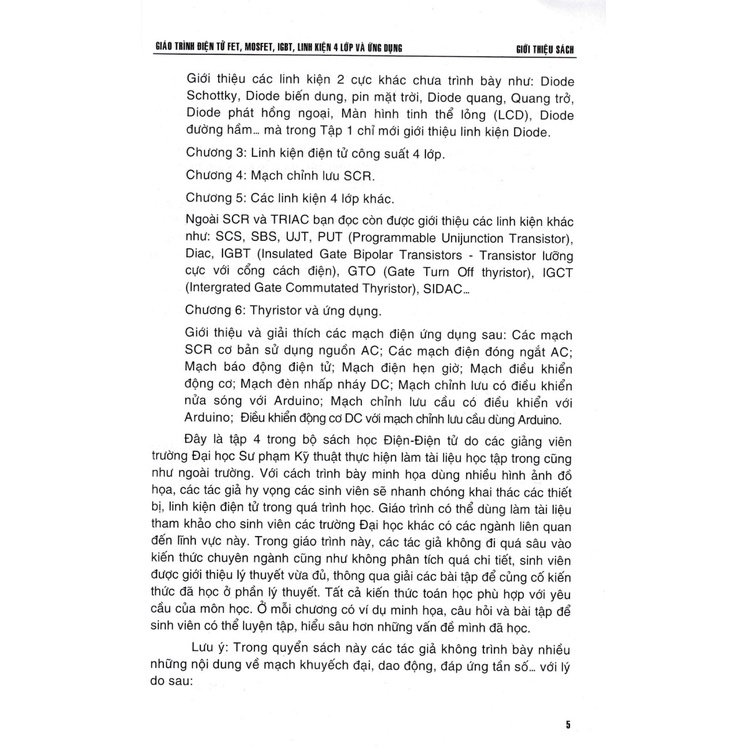 Giáo Trình Điện Tử FET - MOSFET - IGBT Linh Kiện 4 Lớp Và Ứng Dụng Điện tử là môn học cơ bản trong các Khoa Điện – Điện tử của nhiều trường. Cuốn “GIÁO TRÌNH ĐIỆN TỬ FET, MOSFET, IGBT, LINH KIỆN 4 LỚP VÀ ỨNG DỤNG" được biên soạn dựa trên cơ sở chương trình môn học Điện tử, dùng trong các trường Cao đẳng, Đại học khối công nghệ. Nó cung cấp cho sinh viên những kiến thức và kỹ năng cơ bản nhất của môn học và còn nhiều hơn thế nữa. Vì vậy, hiểu và thực hành theo những nội dung trong môn học này là việc không thể thiếu của các học sinh, sinh viên chuyên ngành Điện – Điện tử. Môn học Điện tử ngoài việc nghiên cứu bản chất vật lý, các quá trình diễn ra trong các linh kiện điện tử thụ động như R, L, C và các linh kiện tích cực như Diode, Fet, MosFET, IGBT, Thyristor, GTO, Triac, SID, MCT làm việc ở chế độ, khuếch đại, dao động, chuyển mạch trong quá trình biến đổi điện năng, khảo sát các tính năng kỹ thuật và những ứng dụng của các linh kiện này. Môn học còn tìm hiểu các bộ biến đổi qua việc liên kết các linh kiện điện tử và các thiết bị điện khác tạo thành một mạch điện cụ thể bao gồm mạch điều khiển, mạch động lực. Việc tìm hiểu Lý thuyết, tính toán và thực hành các linh kiện thụ động và tích cực đều có ý nghĩa quan trọng. Trong năm 2020-2023 tủ sách STK biên soạn bộ sách học Điện tử gồm những chuyên đề sau: