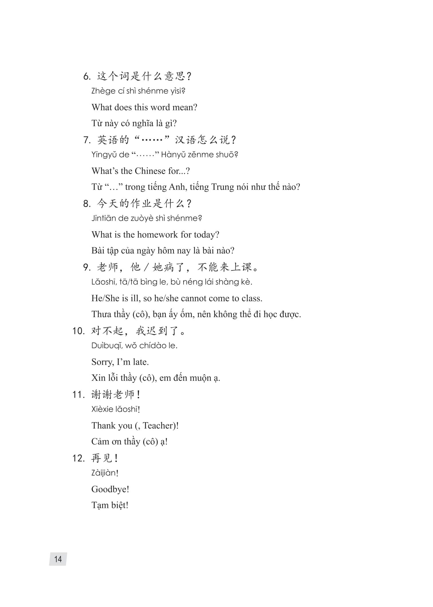 - Chú thích Phần chú thích trong giai đoạn ngữ âm chủ yếu giới thiệu kiến thức cơ bản về ngữ âm tiếng Hán. Còn ở giai đoạn ngữ pháp và mẫu câu, chủ yếu giới thiệu và giải thích một số kiến thức trọng điểm về ngôn ngữ và bối cảnh văn hóa Trung Quốc. Đối với những câu có điểm ngữ pháp xuất hiện trong bài khóa nhưng chưa được giải thích, hãy để sinh viên được hiểu nghĩa thông qua phần dịch nội dung chú thích.