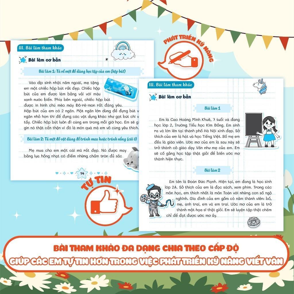 - Bài làm tham khảo đa dạng và chia theo các dạng bài: Giúp rèn luyện kỹ năng viết và mở rộng vốn từ vựng của trẻ, đồng thời giúp các em tự tin hơn trong việc phát triển kỹ năng viết văn. Công ty phát hành: Megabook Nhà xuất bản: ĐH Quốc gia Hà Nội Tác giả: Trịnh Thu Trang - Nguyễn Thanh Trà Kích thước: 19 x 26.5 cm Loại bìa: Bìa mềm Số trang: 148 Năm phát hành: 2024