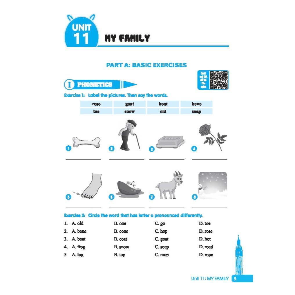 +Phần bài tập cơ bản: được thiết kế để giúp các em củng cố và hiểu sâu hơn về kiến thức Tiếng Anh được học trong từng đơn vị bài học trên lớp. Các bài tập ở phần này giúp các em áp dụng những kiến thức đã học vào các tình huống thực tế, từ vựng, ngữ pháp đến rèn luyện các kỹ năng đọc viết, giao tiếp.