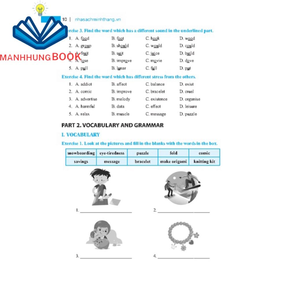 *Mỗi đơn vị bài tập gồm 4 phần:PART A: VOCABULARY (Từ vựng theo từng đơn vị bài học)PART B: PRONUNCIATION (Lý thuyết phát âm)PART C: GRAMMAR (Lý thuyết ngữ pháp trọng tâm)PART D: PRACTICE (Củng cố phát âm, từ vựng, ngữ pháp, kỹ năng đọc và kỹ năng viết)