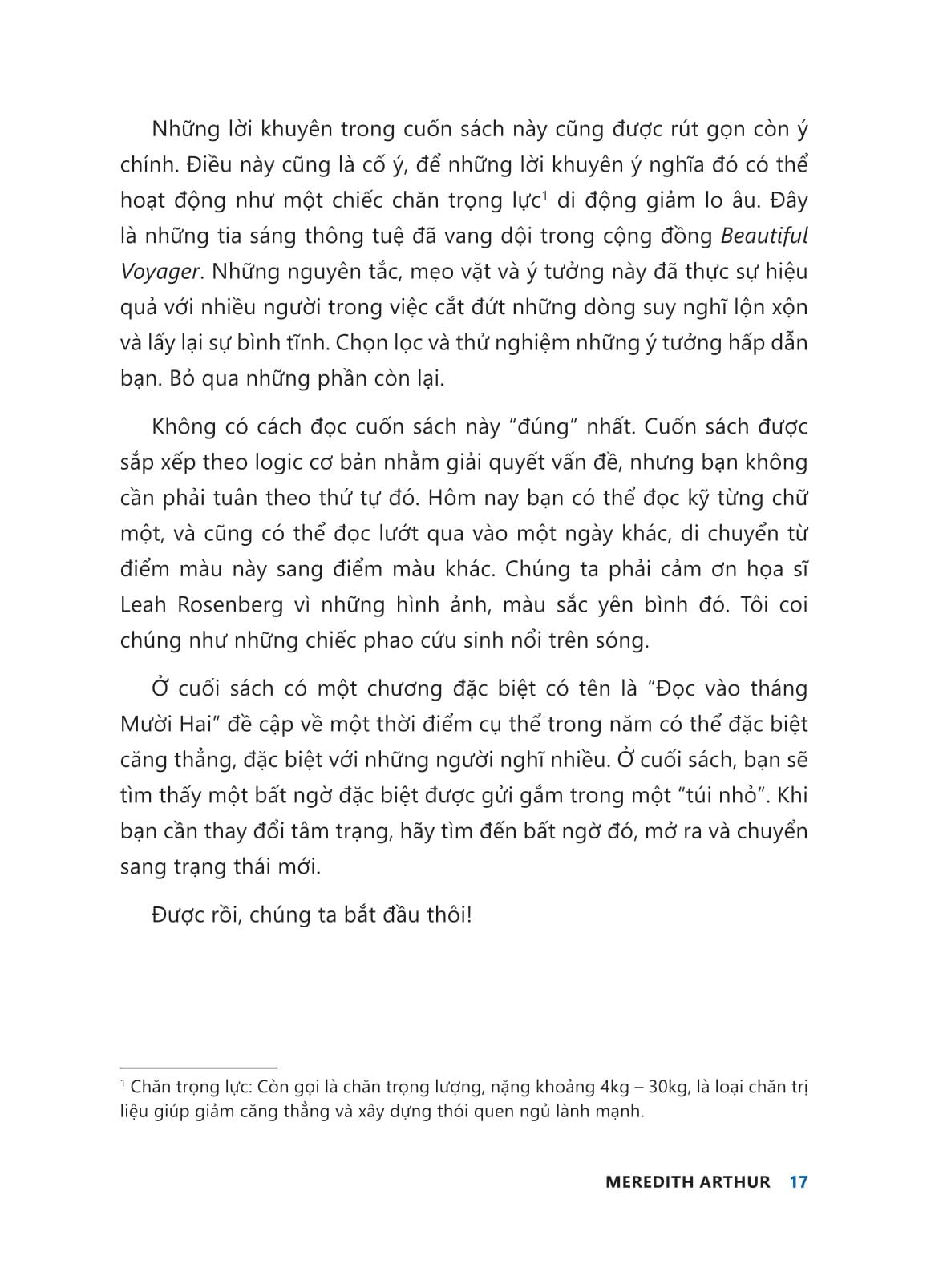 Cung cấp các kỹ thuật xoa dịu để hiểu được sự lo lắng và vượt qua những cạm bẫy của việc suy nghĩ quá mức. Hướng đến đối tượng độc giả hiện đại đang tìm kiếm sự hỗ trợ. Hình minh họa đẹp mắt tạo cảm giác vui vẻ để đối phó với sự lo lắng và xoa dịu những suy nghĩ căng thẳng, thông qua các bài tập dễ dàng, những thông tin ngắn gọn và hình ảnh minh họa nhẹ nhàng.