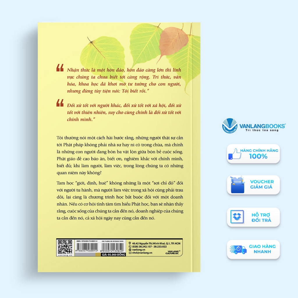 Hòa Thượng Nói Với Doanh Nhân Nhận thức là một hòn đảo, hòn đảo càng lớn thì lĩnh vực chúng ta chưa biết tới càng rộng. Tri thức, văn hóa, khoa học đã khơi mở tư tưởng cho con người, nhưng đừng tùy tiện nói: Tôi biết rồi.” Đối xử tốt với người khác, đối xử tốt với xã hội, đối xử tốt với thiên nhiên, suy cho cùng chính là đối xử tốt với chính mình.” Tôi thường nói một cách hài hước rằng, những người thật sự cần tới Phật pháp không phải nhà sư hay ni cô trong chùa, mà chính là những con người đang bôn ba vật lộn giữa bộn bề cuộc sống. Phật giáo đề cao báo ân, biết ơn, nghiêm khắc với chính mình, biết đủ; khi làm người, làm việc, trong lòng chúng ta có những quan niệm này không? Tam học “giới, định, huệ” không những là một “sợi chỉ đỏ” đối với người tu hành, mà người làm việc trong xã hội cũng phải trau dồi, lại càng là chương trình học bắt buộc đối với một doanh nhân. Nếu có cơ hội tĩnh tâm tìm hiểu Phật học, bạn sẽ nhận thấy rằng, cuộc sống của chúng ta cần đến nó, doanh nghiệp của chúng ta cần đến nó, cả xã hội ngày nay cũng cần đến nó.