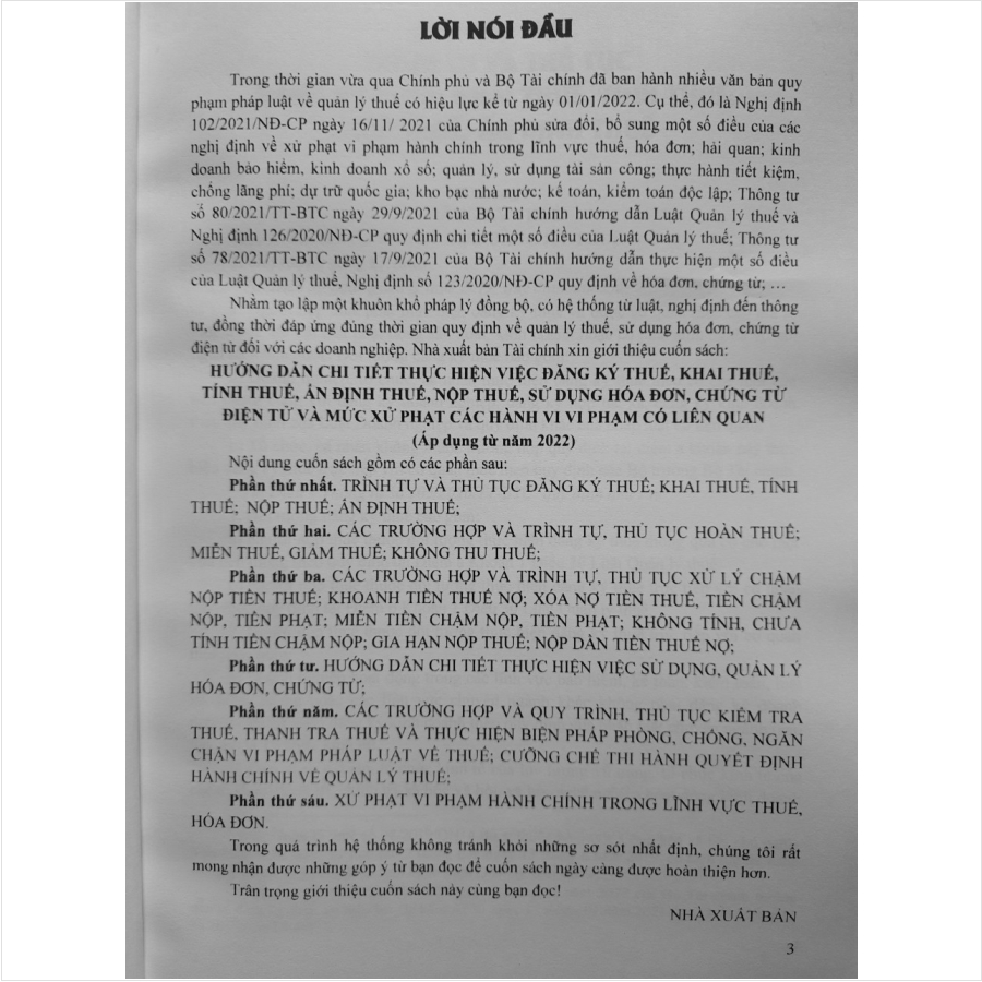 Nhằm tạo lập một khuôn khổ pháp lý đồng bộ, có hệ thống từ luật, nghị định đến thông tư, đồng thời đáp ứng đúng thời gian quy định về quản lý thuế, sử dụng hóa đơn, chứng từ điện tử đối với các doanh nghiệp. Nhà sách Nam Việt xin trân trọng giới thiệu cuốn sách: Hướng Dẫn Chi Tiết Thực Hiện Việc Đăng Ký Thuế, Khai Thuế, Tính Thuế, Ấn Định Thuế, Nộp Thuế, Sử Dụng Hóa Đơn, Chứng Từ Điện Tử (áp dụng từ năm 2022)