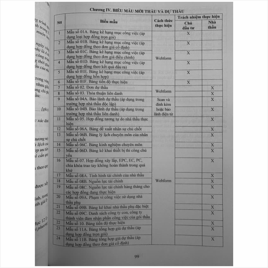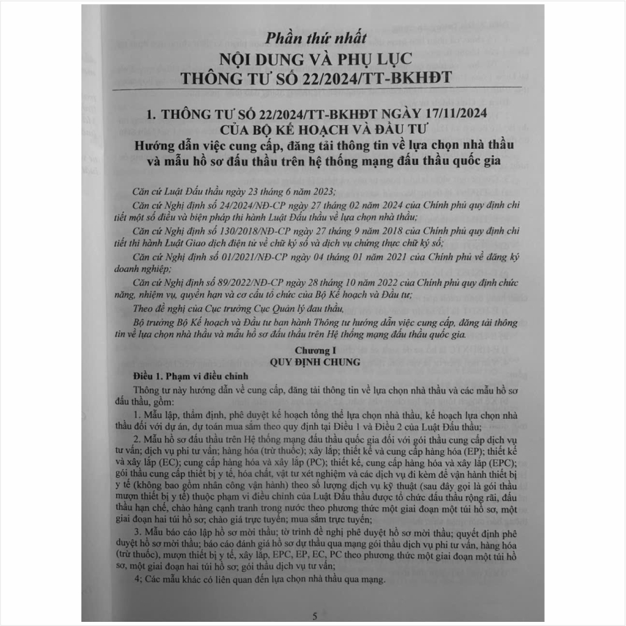 - Toàn bộ sách bìa mềm khổ lớn 20 x 28 cm phân phối bởi Nhà sách Nam Việt đều được bọc sách Plastic MIỄN PHÍ và xuất hóa đơn điện tử đầy đủ, nhanh chóng. …/… Lời giới thiệu: Ngày 17/11/2024, Bộ Kế hoạch và Đầu tư đã ban hành Thông tư số 22/2024/TT-BKHĐT hướng dẫn việc cung cấp, đăng tải thông tin về lựa chọn nhà thầu và mẫu hồ sơ đấu thầu trên Hệ thống mạng đấu thầu quốc gia. Thông tư 22/2024/TT-BKHĐT là một văn bản pháp luật quan trọng, đánh dấu bước tiến mới trong việc quản lý và điều hành các hoạt động đấu thầu, thúc đẩy việc minh bạch và hiệu quả trong lĩnh vực đấu thầu tại Việt Nam. Thông tư 22/2024/TT-BKHĐT cung cấp 42 mẫu hồ sơ chuẩn hóa (Từ Mẫu 1A tới Mẫu 14D) và 17 phụ lục (Từ Phụ lục 1A- Phụ lục 10), chính thức có hiệu lực từ 01/01/2025 (một phần hiệu lực từ 01/12/2024). Để kịp thời đáp ứng nhu cầu thông tin của các cơ quan, ban, ngành cùng các nhà thầu, nhà đầu tư và đông đảo bạn đọc trong cả nước về các quy định pháp luật mới trong lĩnh vực đấu thầu, Nhà sách Nam Việt xin trân trọng giới thiệu cuốn sách: Hướng Dẫn Cung Cấp, Đăng Tải Thông Tin về Lựa chọn Nhà Thầu và Mẫu Hồ Sơ Đấu Thầu Trên Hệ Thống Mạng Đấu Thầu Quốc Gia - Tuyển Tập Mẫu Hồ Sơ Mời Thầu Xây Lắp (Quyển 1) …//… Nội dung quyển 1 gồm các nội dung sau: MẪU SỐ 3A. Hồ Sơ Mời Thầu Xây Lắp Qua Mạng Một Giai Đoạn Một Túi Hồ Sơ MẪU SỐ 3B. Hồ Sơ Mời Thầu Xây Lắp Qua Mạng Một Giai Đoạn Hai Túi Hồ Sơ MẪU SỐ 3C. Hồ Sơ Mời Sơ Tuyển Xây Lắp Qua Mạng MẪU SỐ 8A. Hồ Sơ Mời Thầu Thiết Kế Và Xây Lắp (EC) Qua Mạng Một Giai Đoạn Một Túi Hồ Sơ MẪU SỐ 8B. Hồ Sơ Mời Thầu Thiết Kế Và Xây Lắp (EC) Qua Mạng Một Giai Đoạn Hai Túi Hồ Sơ MẪU SỐ 8C. Hồ Sơ Mời Sơ Tuyển Thiết Kế Và Xây Lắp (EC) Qua Mạng …//… Quý khách tham khảo thêm nội dung cuốn 2 như sau: MẪU SỐ 9A. Hồ Sơ Mời Thầu Cung Cấp Hàng Hóa Và Xây Lắp (PC) Qua Mạng Theo Phương Thức Một Giai Đoạn Một Túi Hồ Sơ MẪU SỐ 9B. Hồ Sơ Mời Thầu Cung Cấp Hàng Hóa Và Xây Lắp Qua Mạng Theo Phương Thức Một Giai Đoạn Hai Túi Hồ Sơ MẪU SỐ 9C. Hồ Sơ Mời Sơ Tuyển Cung Cấp Hàng Hóa Và Xây Lắp (PC) Qua Mạng MẪU SỐ 10A. Hồ Sơ Mời Thầu Thiết Kế, Cung Cấp Hàng Hóa Và Xây Lắp (EPC) Qua Mạng Một Giai Đoạn Một Túi Hồ Sơ MẪU SỐ 10B. Hồ Sơ Mời Thầu Thiết Kế, Cung Cấp Hàng Hóa Và Xây Lắp (EPC) Qua Mạng Một Giai Đoạn Hai Túi Hồ Sơ MẪU SỐ 10C. Hồ Sơ Mời Sơ Tuyển Thiết Kế, Cung Cấp Hàng Hóa Và Xây Lắp (EPC) Qua Mạng Quý khách hàng hãy an tâm khi mua sách tại Nhà sách Nam Việt, cam kết uy tín, chất lượng, sách bản gốc chuẩn đẹp, được kiểm hàng, hài lòng mới thanh toán, sách đã được bọc plastic cao cấp miễn phí! ..//... Cảm ơn các bạn đã ghé thăm shop Nhà sách Nam Việt ! Sách Hướng Dẫn Cung Cấp, Đăng Tải Thông Tin về Lựa chọn Nhà Thầu và Mẫu Hồ Sơ Đấu Thầu Trên Hệ Thống Mạng Đấu Thầu Quốc Gia - Tuyển Tập Mẫu Hồ Sơ Mời Thầu Xây Lắp (Quyển 1) Sách Hướng Dẫn Cung Cấp, Đăng Tải Thông Tin về Lựa chọn Nhà Thầu và Mẫu Hồ Sơ Đấu Thầu Trên Hệ Thống Mạng Đấu Thầu Quốc Gia - Tuyển Tập Mẫu Hồ Sơ Mời Thầu Xây Lắp (Quyển 1)