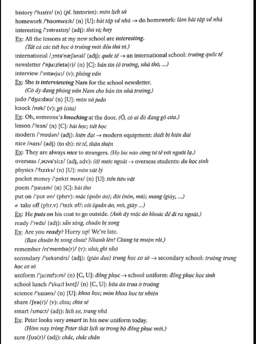 - Từ vựng (Vocabulary): gồm tất cả các từ mới trong bài; các từ được phiên âm theo hệ phiên âm quốc tế, có nghĩa sát với nghĩa trong bài học và có một số ví dụ minh họa.