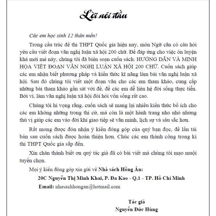 Trong cấu trúc đề thi THPT Quốc gia hiện nay, môn Ngữ căn có câu hỏi yêu cầu viết đoạn văn nghị luận xã hội 200 chữ. Để đáp ứng cho việc ôn luyện khá mới mẻ này, chúng tôi đã biên soạn cuốn sách: HƯỚNG DẪN VÀ MINH HỌA VIẾT ĐOẠN VĂN NGHỊ LUẬN XÃ HỘI 200 CHỮ. Cuốn sách giúp các em nhận biết phương pháp và kiến thức kĩ năng làm bài văn nghị luận xã hội. Sau đó chúng tôi viết một đoạn văn cho các em tham khảo, cung cấp những bài tham khảo gần sát với đề, để các em dễ liên hệ đời sống thực tiễn. Bởi vì, làm văn nghị luận xã hội đòi hỏi vốn sống rất cao.