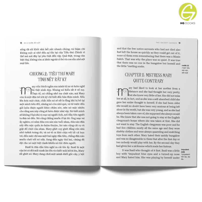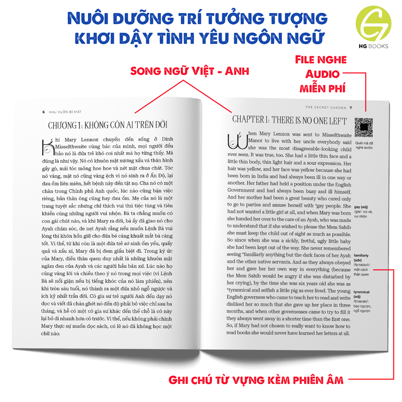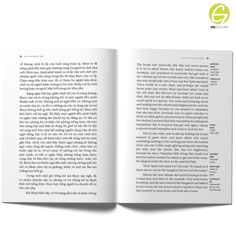 - Những điểm nổi bật của tác phẩm: Tác phẩm thiếu nhi kinh điển được yêu mến suốt hơn một thế kỷ The Secret Garden – Khu Vườn Bí Mật là một trong những cuốn sách văn học thiếu nhi vĩ đại nhất mọi thời đại. Không chỉ chạm đến trái tim trẻ em, mà còn khiến người lớn rung động bởi thông điệp dịu dàng và sâu sắc. Nguồn cảm hứng bất tận cho điện ảnh, sân khấu và nghệ thuật Ngay từ thập niên 1910, tác phẩm đã được chuyển thể thành nhiều phiên bản phim, hoạt hình, kịch sân khấu. Mỗi lần xuất hiện đều mang lại xúc cảm mới mẻ và được khán giả toàn thế giới đón nhận nồng nhiệt. Dịch ra hơn 50 ngôn ngữ – lan tỏa giá trị vượt thời gian Là một trong số ít tác phẩm thiếu nhi được chuyển ngữ rộng khắp, Khu Vườn Bí Mật tiếp tục gieo mầm yêu thương ở mọi nền văn hóa – như chính khu vườn từng bị lãng quên, rồi lại nở hoa rực rỡ. Phiên bản song ngữ Việt – Anh độc quyền từ HG Books Được biên dịch trau chuốt, dễ hiểu mà vẫn giữ nguyên vẻ đẹp văn chương. Kèm theo file nghe audio và phần ghi chú từ vựng – giúp các bạn nhỏ vừa thưởng thức tác phẩm kinh điển, vừa nâng cao khả năng tiếng Anh một cách tự nhiên, nhẹ nhàng.