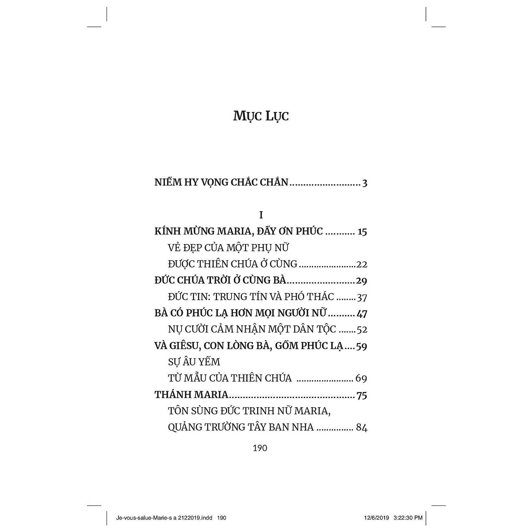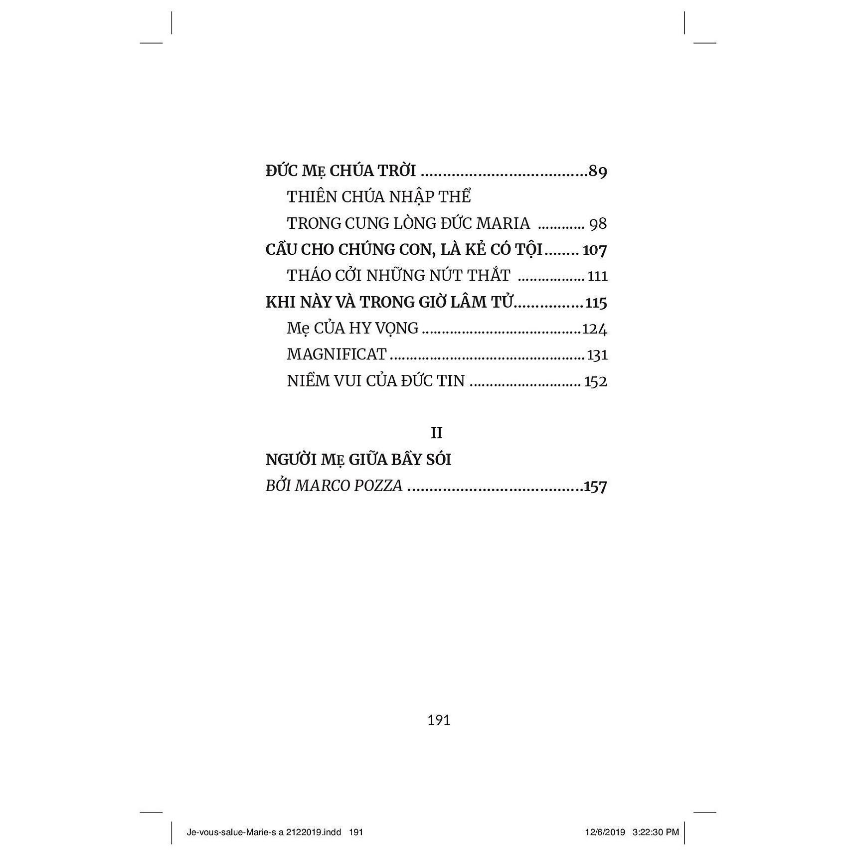 Sau kinh nghiệm trong cuộc đối thoại thiêng liêng với cha Marco Pozza về Kinh Lạy Cha, tôi thấy hữu ích để cùng với cha Marco làm một lời cầu xin khác, lời cầu xin đã đồng hành cùng chúng tôi từ thuở thơ ấu. Kinh Kính Mừng chúng ta đã được học lúc còn rất trẻ và ngay khi chúng ta bỏ quên kinh nguyện này, khi gặp những trở ngại, nó lại trở về trên miệng lưỡi của chúng ta, nhưng hơn hết là trong trái tim của chúng Thánh Cyprien de Carthage, người Phi châu, vị thánh giám mục và tử đạo của Giáo Hội vào thế kỷ III, không ai có thể xem Thiên Chúa là Cha nếu người đó không có Hội Thánh là Mẹ (xem De l’unité de l’Eglise catholique, 6). Nơi Đức Maria, chúng ta chiêm ngắm khuôn mặt đẹp đẽ của Mẹ Hội Thánh, chúng ta nhận ra “giấc mơ Giêsu” dành cho mỗi người và niềm hy vọng sống bao trùm lên chúng ta, dù trái tim của chúng ta chứa đầy những nghịch lý. Và như thế, khi Giáo Hội đồng hành với chúng ta và hé mở cho chúng ta thấy Thiên Chúa thật tốt lành (xem 1P 2,3), thì chính Đức Maria cho chúng ta sự can đảm, vì mong muốn lớn nhất của Mẹ là dẫn đưa tất cả chúng ta đến với Chúa Cha: dù chúng ta vẫn còn những chia rẽ, chúng ta vẫn có thể trở nên một gia đình duy nhất trong Chúa Giêsu, là Con của Mẹ, Thiên Chúa của chúng ta, Vua của lòng thương xót và là đầu của Giáo Hội.