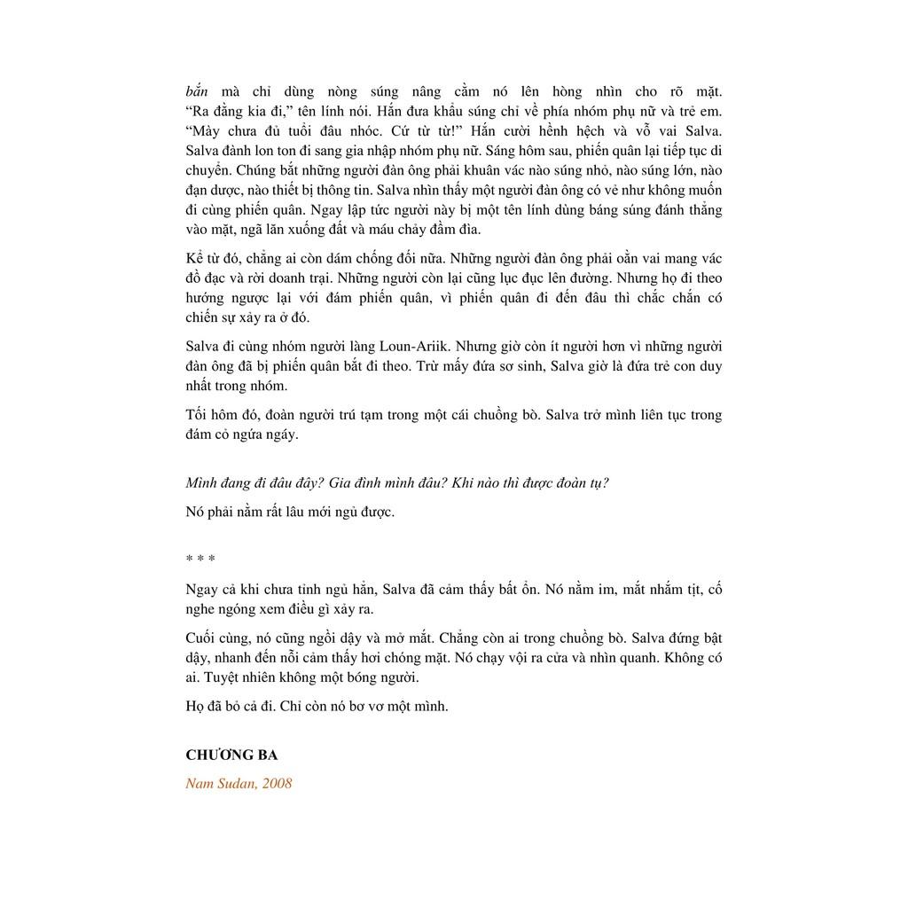 nữa. Nó lê từng bước. Liên tục như vậy trong mấy giờ đồng hồ cho tới khi mặt trời gần tắt hẳn. Đi cùng nó còn rất nhiều người nữa. Nhiều đến mức mà nó chắc rằng nguyên làng, nơi có trường nó học, cũng không thể nhiều người đến vậy. Hẳn là toàn bộ số người của cả vùng đất này đang cùng di tản. Vừa đi, những ý nghĩ miên man cứ hiện lên trong đầu Salva theo từng nhịp bước. Mình đang đi đâu đây? Gia đình mình đâu? Liệu mình có còn đượcgặp lại gia đình không?Đoàn người dừng lại khi trời tối hẳn không còn nhìn thấy lối đi nữa. Ban đầu họ đứng tản mát, thi thoảng có vài tiếng rì rầm, nhưng phần lớn đều lặng im trong sợ hãi.