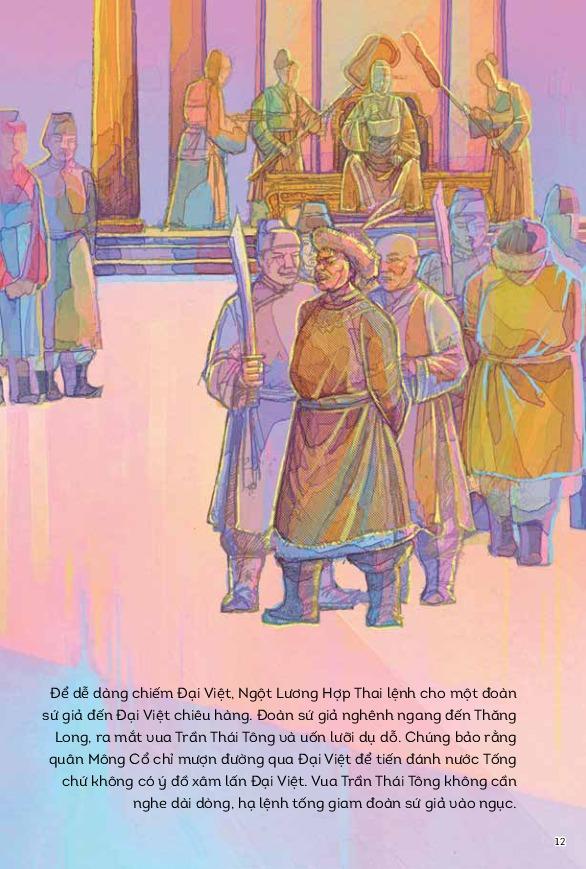 Lịch Sử Việt Nam Bằng Tranh - Chiến Thắng Quân Mông Lần 1 Người Mông Cổ, vốn vẫn bị nhà Tống miệt thị là man di, phút chốc bỗng trở nên hùng mạnh, nuôi mộng bành trướng, xua quân đi khắp Á-Âu tiến hành xâm lược. Nước ta tuy nhỏ nhưng có địa thế chiến lược, có thể được dùng làm bàn đạp tấn công nhà Tống, thâu tóm Trung Hoa, nên chẳng thể nằm ngoài sự dòm ngó của chúng. Chúng khinh bạc cho rằng ta chỉ là tiểu quốc, chỉ cần hù dọa rồi lại vỗ về lừa bịp, chiếm được nước ta dễ như trở bàn tay. Chúng chẳng thể ngờ rằng nước ta tuy nhỏ, dân ta tuy thưa nhưng không thiếu hào kiệt. Vận nước gặp buổi lâm nguy cũng là lúc rõ mặt kẻ anh hùng. Dẫu cũng là kẻ bạc nhược, sinh lòng hám lợi mê danh, nhưng ở bên bậc minh quân chẳng thiếu bề tôi trung, lại thao lược việc quân, quên thân vì nước. Chẳng những thế, dân - quân một lòng, chẳng tiếc thân vì nước. Vậy nên thế giặc mạnh mà ta không nao núng, chẳng mấy chốc mà đuổi được kẻ thù khuất dạng, sử cũ còn ghi danh.