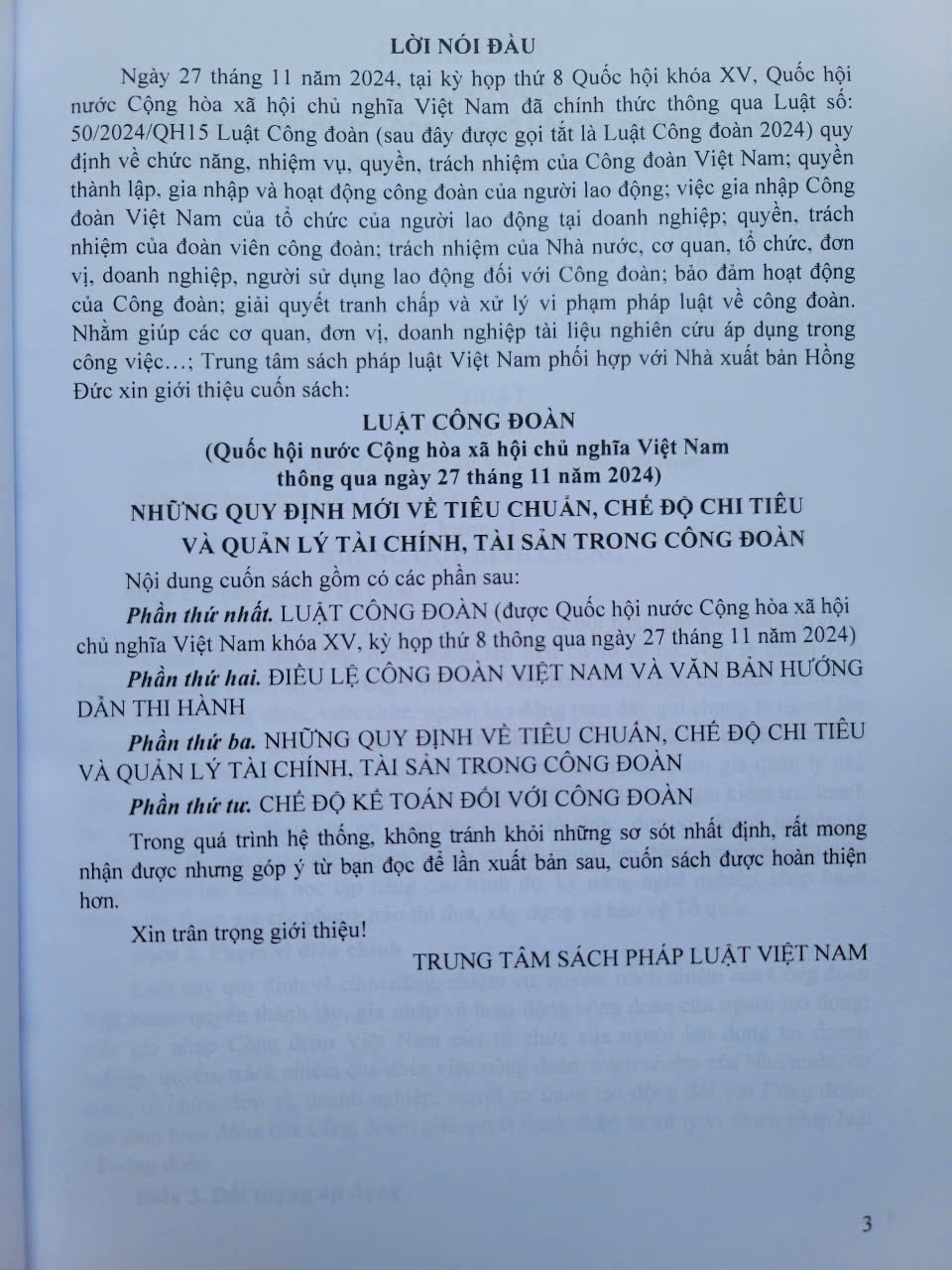 Nhằm phổ biến đến Quý Cơ quan, Đơn vị và Quý khách hàng thân thiết nắm bắt kịp thời những quy định mới nêu trên. Nhà sách Nam Việt xin trân trọng giới thiệu cuốn sách: Luật Công Ðoàn (Quốc hội nước Cộng hòa xã hội chủ nghĩa Việt Nam thông qua ngày 27 tháng 11 năm 2024) – Những Quy Định Mới Về Tiêu Chuẩn, Chế Độ Chi Tiêu Và Quản Lý Tài Chính, Tài Sản Trong Công Đoàn