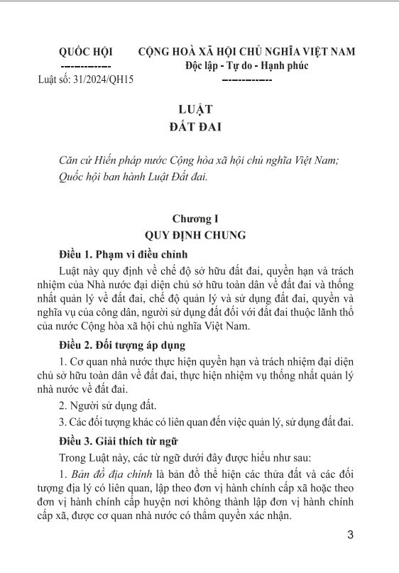 Mua tại TiktokSách - Luật Đất Đai (Nước Cộng Hòa Xã Hội Chủ Nghĩa Việt Nam - Sữa đổi bổ sung năm 2024) - ndbooks Nhà xuất bản: NXB Lao Động Nhà cung cấp ndbooks Tác giả: Nhiều tác giả Loại bìa: Bìa Mềm Số trang: 300 Năm xuất bản: 2025 LUẬT ĐẤT ĐAI Căn cứ Hiến pháp nước Cộng hòa xã hội chủ nghĩa Việt Nam; Quốc hội ban hành Luật Đất đai. Chương I QUY ĐỊNH CHUNG Điều 1. Phạm vi điều chỉnh Luật này quy định về chế độ sở hữu đất đai, quyền hạn và trách nhiệm của Nhà nước đại diện chủ sở hữu toàn dân về đất đai và thống nhất quản lý về đất đai, chế độ quản lý và sử dụng đất đai, quyền và nghĩa vụ của công dân, người sử dụng đất đối với đất đai thuộc lãnh thổ của nước Cộng hòa xã hội chủ nghĩa Việt Nam. Điều 2. Đối tượng áp dụng
