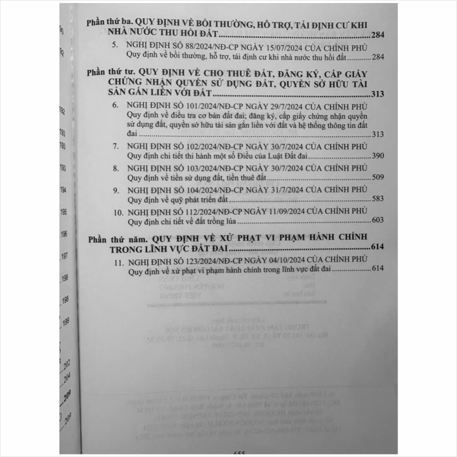 - Nghị định số 123/2024/NĐ-CP ngày 04/10/2024 Quy định về xử phạt vi phạm hành chính trong lĩnh vực đất đai Để giúp bạn đọc thuận tiện tra cứu, tham khảo Luật Đất đai, Luật sửa đổi, bổ sung một số điều của Luật Đất đai số 31/2024/QH15, và các nghị định hướng dẫn thi hành mới nhất, Nhà sách Nam Việt xin trân trọng giới thiệu cuốn sách: Luật Đất Đai (sửa đổi, bổ sung 2024) – Và Các Văn Bản Hướng Dẫn Thi Hành Về Giá Đất, Bồi Thường, Hỗ Trợ, Tái Định Cư Khi Nhà Nước Thu Hồi Đất …//… Nội dung cuốn sách gồm các phần chính sau: Phần thứ nhất. LUẬT ĐẤT ĐAI 2024 Phần thứ hai. QUY ĐỊNH MỚI VỀ GIÁ ĐẤT Phần thứ ba. QUY ĐỊNH VỀ BỒI THƯỜNG, HỖ TRỢ, TÁI ĐỊNH CƯ KHI NHÀ NƯỚC THU HỒI ĐẤT Phần thứ tư. QUY ĐỊNH VỀ CHO THUÊ ĐẤT, ĐĂNG KÝ, CẤP GIẤY CHỨNG NHẬN QUYỀN SỬ DỤNG ĐẤT, QUYỀN SỞ HỮU TÀI SẢN GẮN LIỀN VỚI ĐẤT *** Quý khách hàng hãy an tâm khi mua sách tại Nhà sách Nam Việt, cam kết uy tín, chất lượng, sách bản gốc chuẩn đẹp, được kiểm hàng, hài lòng mới thanh toán, sách đã được bọc plastic cao cấp miễn phí! …//… Cảm ơn các bạn đã ghé thăm shop Nhà sách Nam Việt ! Sách Luật Đất Đai (sửa đổi, bổ sung 2024) – Và Các Văn Bản Hướng Dẫn Thi Hành Về Giá Đất, Bồi Thường, Hỗ Trợ, Tái Định Cư Khi Nhà Nước Thu Hồi Đất Sách Luật Đất Đai (sửa đổi, bổ sung 2024) – Và Các Văn Bản Hướng Dẫn Thi Hành Về Giá Đất, Bồi Thường, Hỗ Trợ, Tái Định Cư Khi Nhà Nước Thu Hồi Đất