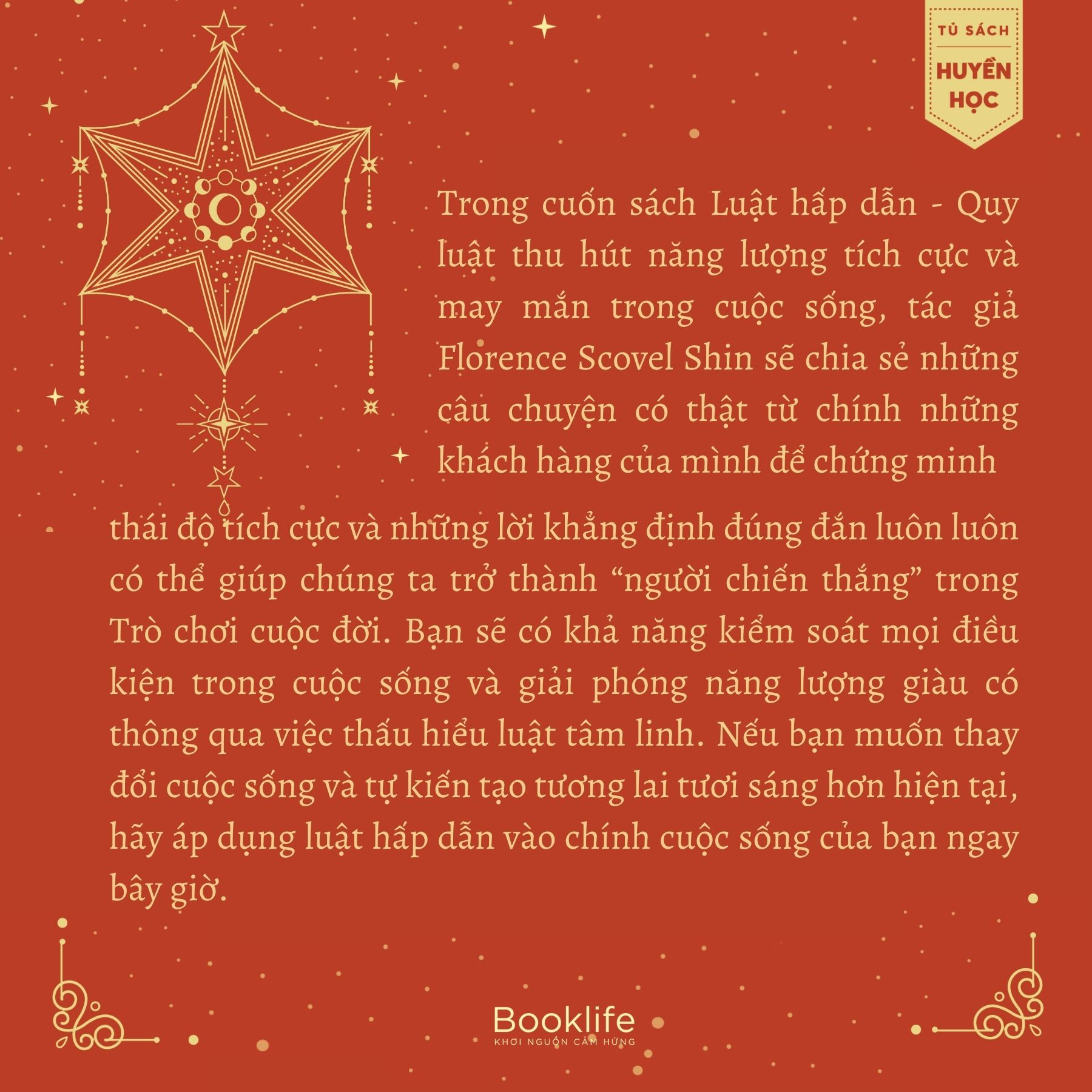Trong cuốn sách Luật hấp dẫn - Quy luật thu hút năng lượng tích cực và may mắn trong cuộc sống, tác giả Florence Scovel Shin sẽ chia sẻ những câu chuyện có thật từ chính những khách hàng của mình để chứng minh thái độ tích cực và những lời khẳng định đúng đắn luôn luôn có thể giúp chúng ta trở thành “người chiến thắng” trong Trò chơi cuộc đời. Bạn sẽ có khả năng kiểm soát mọi điều kiện trong cuộc sống và giải phóng năng lượng giàu có thông qua việc thấu hiểu luật tâm linh. Nếu bạn muốn thay đổi cuộc sống và tự kiến tạo tương lai tươi sáng hơn hiện tại, hãy áp dụng luật hấp dẫn vào chính cuộc sống của bạn ngay bây giờ.