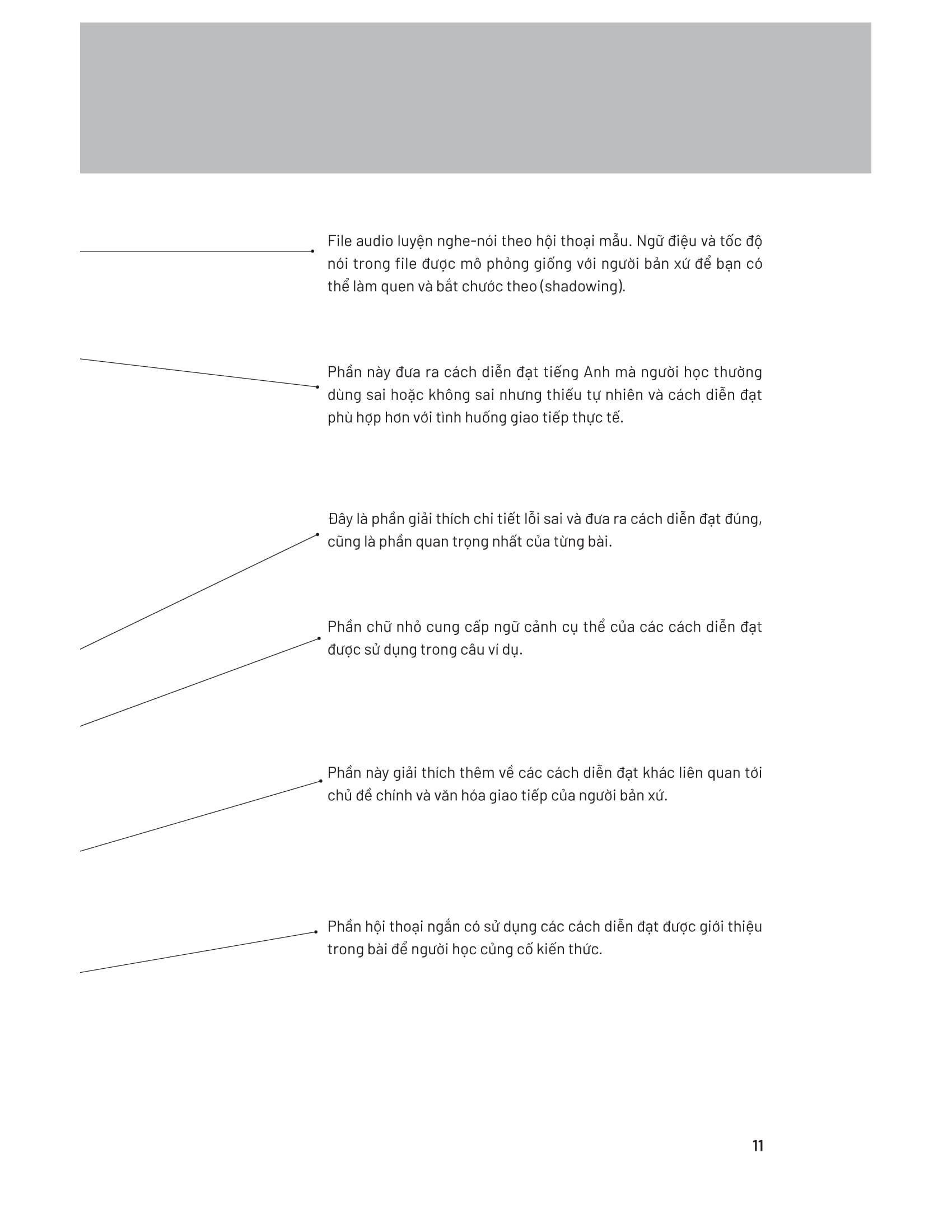 Sách được chia thành 5 phần lớn theo các chủ đề giao tiếp phổ biến, mỗi phần sẽ bao gồm các bài học liên quan đến những tình huống giao tiếp quen thuộc trong đời sống, chỉ ra các cách diễn đạt sai hoặc không sai nhưng chưa khéo, đồng thời giới thiệu cách diễn đạt thay thế phù hợp trong tình huống đó. Ngoài ra, bạn cũng sẽ biết cách sử dụng ngôn ngữ tự nhiên hơn thông qua các câu ví dụ và đoạn hội thoại gần gũi; file audio đi kèm sẽ giúp bạn cải thiện cả kỹ năng nghe-nói.