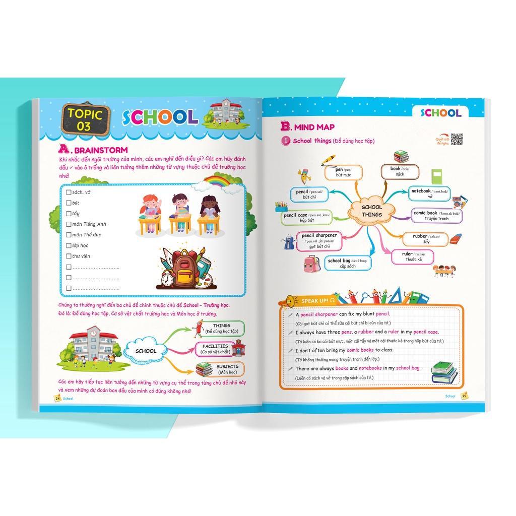Các em sẽ được học từ vựng theo sơ đồ tư duy 1 cách logic, tổng quan và dễ nhớ. Phần Speak up sẽ giúp các em luyện tập và ứng dụng các từ vựng vừa học trong giao tiếp hàng ngày