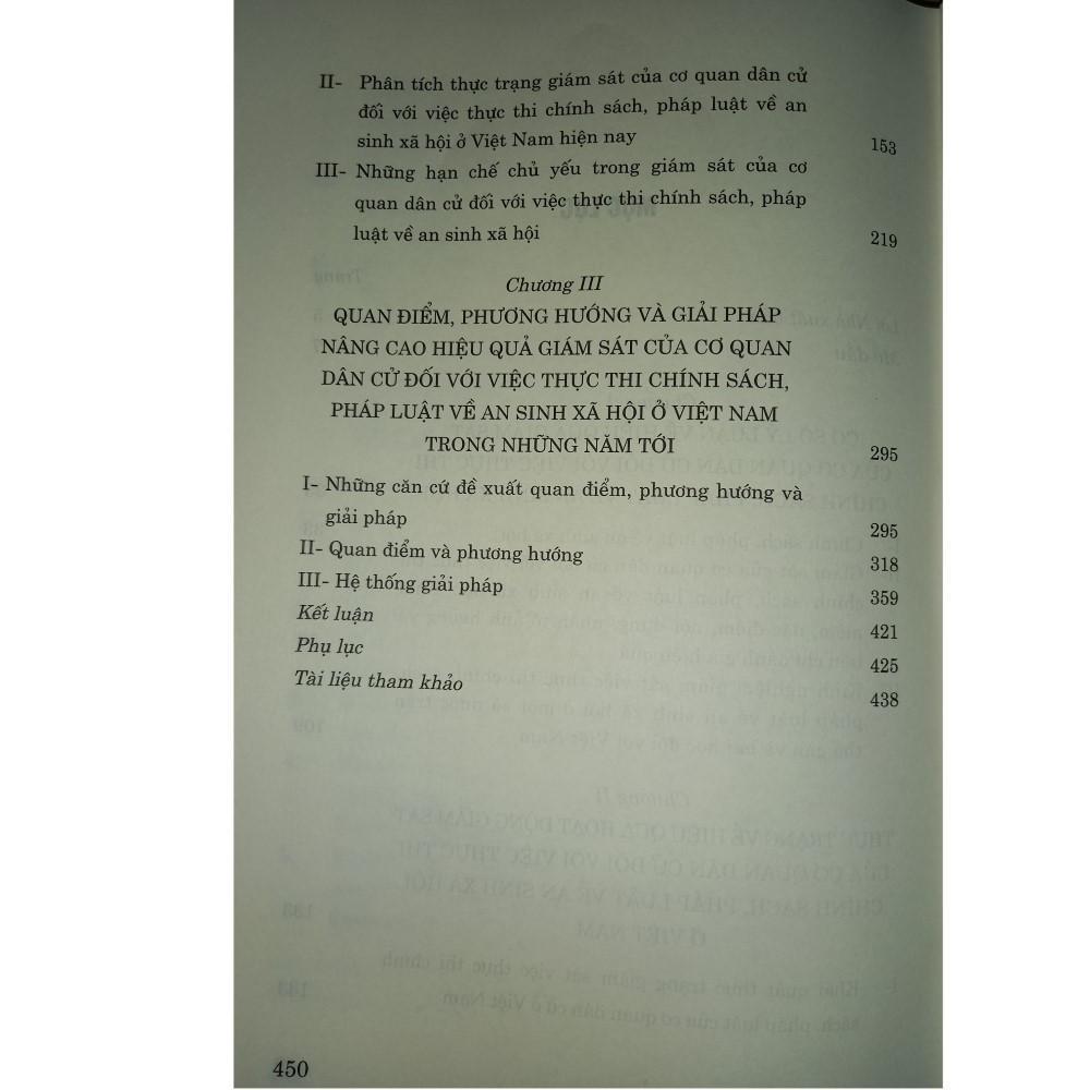 Trên cơ sở đánh giá thực trạng giám sát của Quốc hội và hội đồng nhân dân đối với việc thực thi chính sách, pháp luật về an sinh xã hội hiện nay, các tác giả đề xuất quan điểm, phương pháp và các giải pháp nhằm nâng cao hiệu quả giám sát của cơ quan dân cử đối với việc thực thi chính sách, pháp luật về an sinh xã hội ở nước ta những năm tới. Nội dung chính của cuốn sách gồm ba chương: