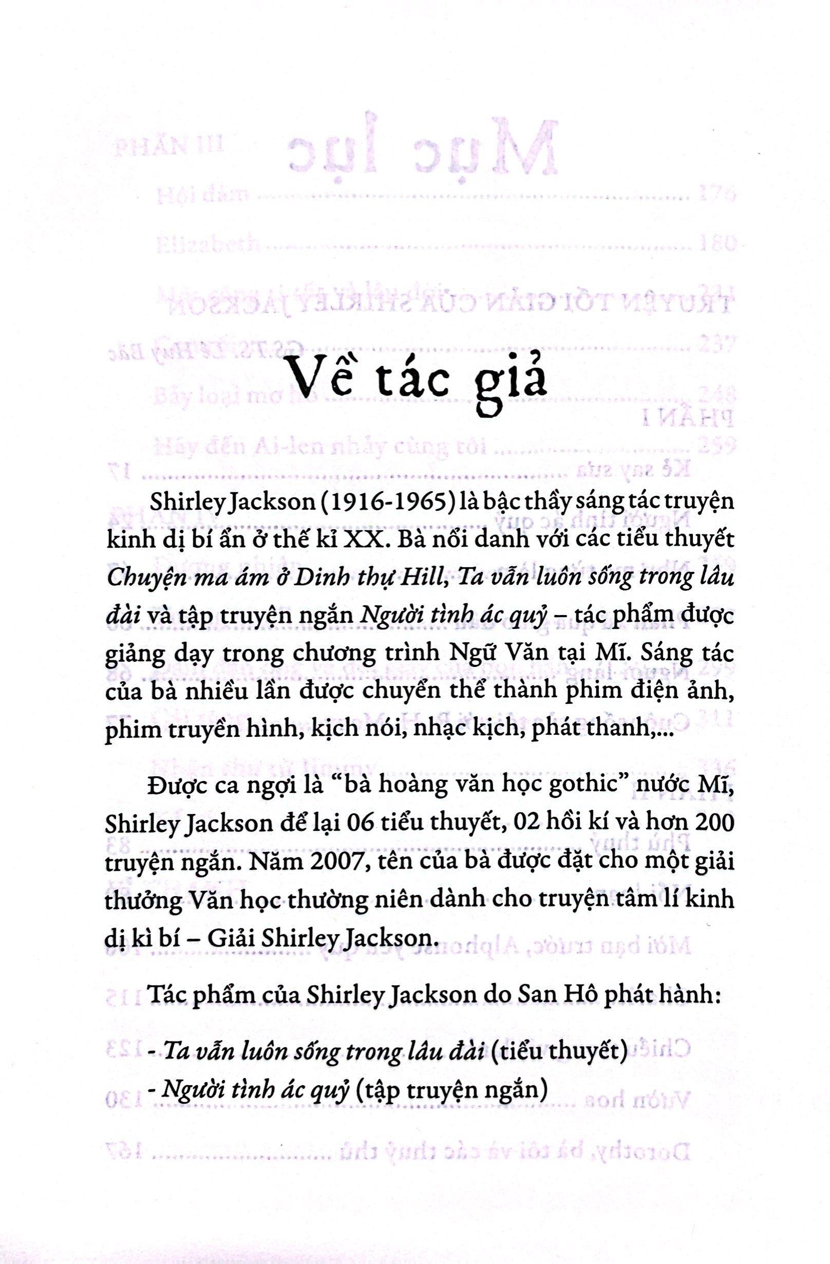 Người Tình Ác Quỷ Giới thiệu sách: Cô tuyệt vọng trở về căn hộ không có bóng anh, vị hôn phu đã vắng mặt trong ngày cưới. Chẳng nơi nào thấy tăm hơi gã đàn ông mặc vét xanh, dường như chỉ m.ình cô biết đến sự tồn tại của con người ấy. Và Người tình ác quỷ cũng là truyện đầu tiên ở tuyển tập này hé lộ hình hài, danh tính cái bóng ma lẩn lút trong hầu khắp các truyện ngắn khác của Shirley Jackson – bóng ma mang tên James Harris. Gã đến cùng cơn loạn thần, gã đến bên những người phụ nữ phải gồng m.ình dưới áp lực kinh hoàng từ chính cuộc sống thường nhật. Khai thác chủ đề kinh dị tâm lí và cái khủng khiếp ẩn trong những tình huống đời thường vốn là biệt tài của Shirley Jackson. Tác phẩm khơi dậy câu hỏi về ý nghĩa tồn tại của cá thể, về nỗi đơn côi bất lực tột cùng của con người trước quyền lực cộng đồng. Shirley Jackson thành công ở cả tiểu thuyết lẫn truyện ngắn, trong đó Người tình ác quỷ chính là tuyển tập chứa đựng một trong những truyện ngắn hay nhất, gây ám ảnh nhất nền văn học Mĩ thế kỉ XX. Tác giả SHIRLEY JACKSON (1916-1965), nữ nhà văn người Mĩ, là bậc thầy sáng tác truyện kinh dị bí ẩn ở thế kỉ XX. Bà nổi danh với các tiểu thuyết Ta vẫn luôn sống trong lâu đài, Chuyện ma ám ở Dinh thự Hill, và truyện ngắn Xổ số – tác phẩm được giảng dạy trong chương trình Ngữ Văn tại Mĩ. Được ca ngợi là “bà hoàng văn học gothic” nước Mĩ, Shirley Jackson để lại 06 tiểu thuyết, 02 hồi kí và hơn 200 truyện ngắn. Năm 2007, tên của bà được đặt cho một giải thưởng văn học thường niên dành cho truyện tâm lí kinh dị kì bí – Giải Shirley Jackson. Tác phẩm của Shirley Jackson do San Hô phát hành: