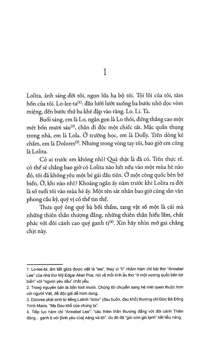 “Lolita, ánh sáng của đời tôi, ngọn lửa nơi hạ bộ của tôi. Tội lỗi của tôi, tâm hồn của tôi. Lo-lee-ta: đầu lưỡi lướt xuống ba bước nhỏ dọc vòm miệng, khẽ đập vào răng ba tiếng. Lo. Li. Ta.