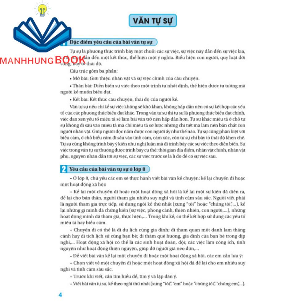 Phần thứ nhất: CÁCH TẠO LẬP CÁC KIỂU VĂN BẢN gồm Tự sự, Miêu tả, Biểu cảm, Thuyết minh. Nghị luận. Nhật dụng. Mỗi kiểu văn bản đều gồm các phần: Khái niệm, yêu cầu, đọc điểm, cách là để giúp các em nắm vững từng kiểu văn bản ở lớp 8