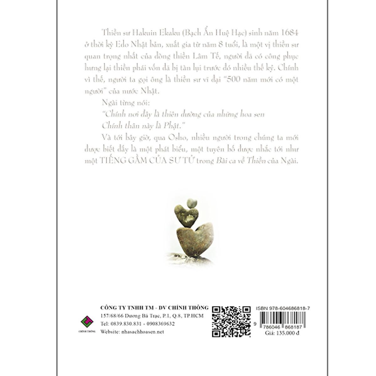 Mua tại TiktokThiền sư Hakuin Ekaku ( Bạch Ẩn Huệ Lac ) sinh năm 1684 ở thời kỳ Edo Nhật Bản, xuất gia từ năm 8 tuổi, là 1 vị thiền sư quan trọng nhất của dòng thiền Lâm Tế, người đã có công phục hưng lại thiền phái vốn đã bị tàn lụi trước đó nhiều thế kỷ. Chính vì thế, người ta gọi ông là thiền sư vĩ đại "500" năm mới có một người của nước Nhật. Ngài từng nói: " Chính nơi đây là thiên đường của những hoa sen Chính thân này là phật " Và tới bây giờ, qua Osho, nhiều người trong chúng ta mới được biết đấy là một phát biểu, một tuyên bố được nhắc tới như một Tiếng Gầm Của Sư Tử trong Bài ca về Thiền của Ngài.