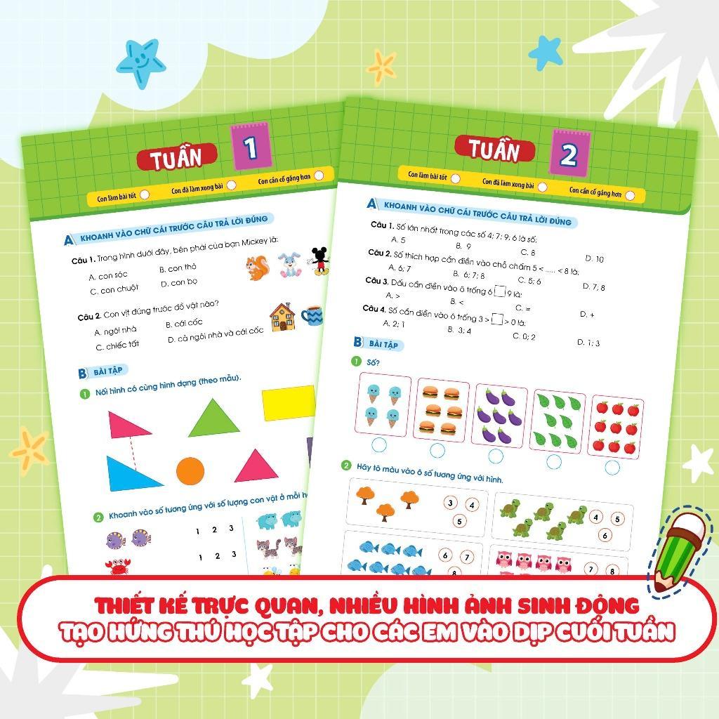 Mua tại TiktokCuối tuần không chỉ để nghỉ ngơi mà còn là thời gian thích hợp ôn tập lại kiến thức đã được học ở trường. Với mong muốn giúp các con nắm vững kiến thức trên lớp trong 35 tuần học, bộ sách Phiếu bài tập cuối tuần đã được biên soạn dành riêng cho học sinh tiểu học từ lớp 1 đến lớp 5 với bộ 3 cuốn: Phiếu bài tập cuối tuần Tiếng Việt, Phiếu bài tập cuối tuần Toán, Phiếu bài tập cuối tuần Tiếng Anh. Phiếu bài tập cuối tuần Toán 1 gồm các bài luyện tập chia theo tuần, ôn tập tổng quát kiến thức của 35 tuần học. Ngoài ra cuốn sách cũng cung cấp các bài kiểm tra giữa kỳ và cuối kỳ để các con trau dồi thêm, tự tin chinh phục điểm cao trong các bài kiểm tra trên lớp. Phiếu bài tập cuối tuần Toán 1 có những ưu điểm như sau: