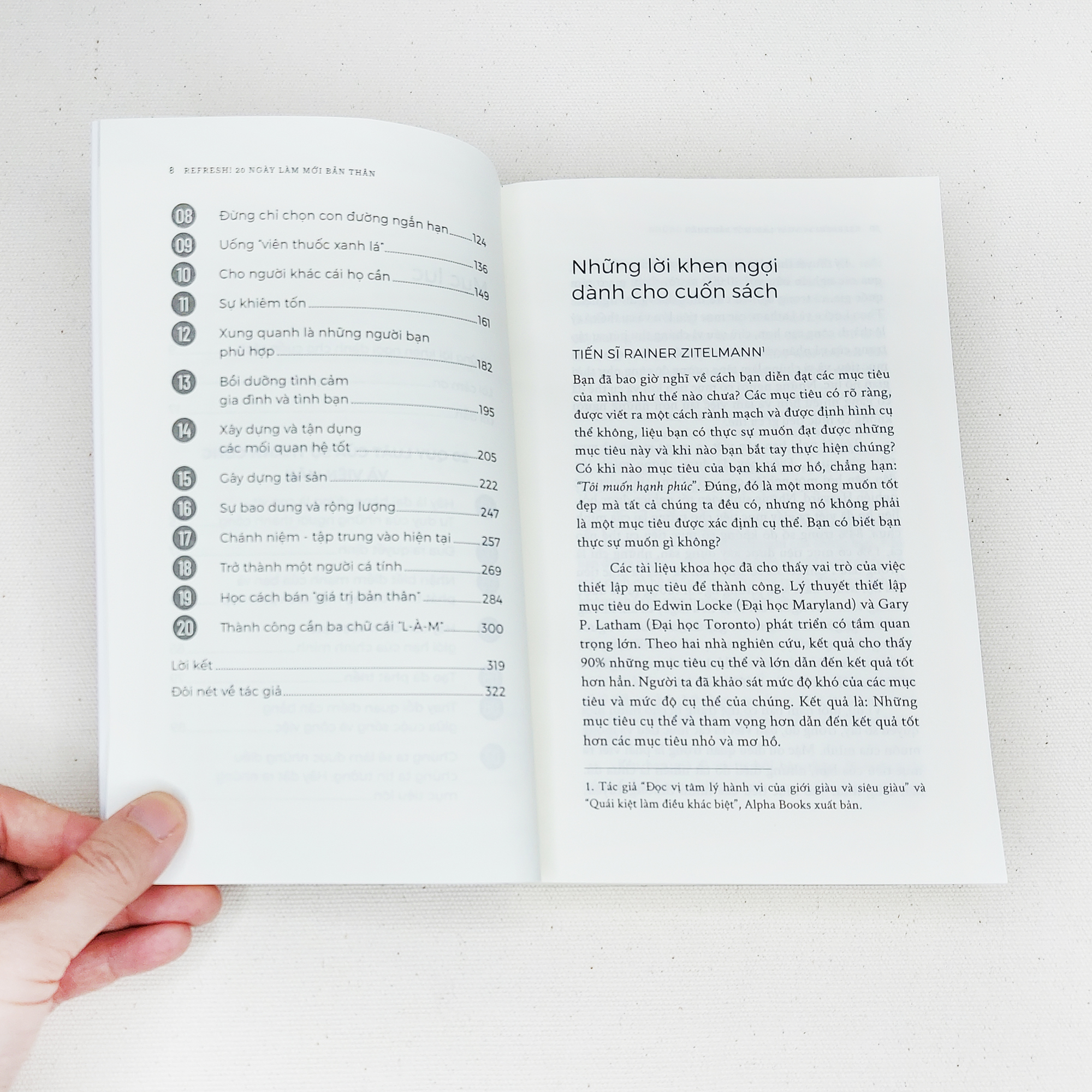 Mua tại TiktokSách - Refresh! 20 Ngày Làm Mới Bản Thân Vĩ nhân của nền văn học thế giới Johann Wolfgang von Goethe từng nói: “Không ai biết một người có sức mạnh để đi được bao xa cho đến khi anh ấy thử cố gắng.” Trước vòng xoay không ngừng của cuộc sống, rất nhiều người đã từ bỏ sự cố gắng, đánh mất sự tự tin hay chật vật để tìm lại và khám phá chính mình - một phiên bản mới mẻ, gai góc và dũng cảm hơn. Chúng ta bị nỗi sợ thất bại thống trị và áp chế. “Refresh! 20 ngày làm mới bản thân” là cuộc hành trình đi vào nội tâm để khám phá những điểm mạnh, điểm yếu của chính mình, từ đó xây dựng lộ trình cụ thể để cải tiến bản thân, hướng tới cuộc sống tích cực, hạnh phúc và ngày càng trọn vẹn. +Đánh giá chung về cuốn sách:
