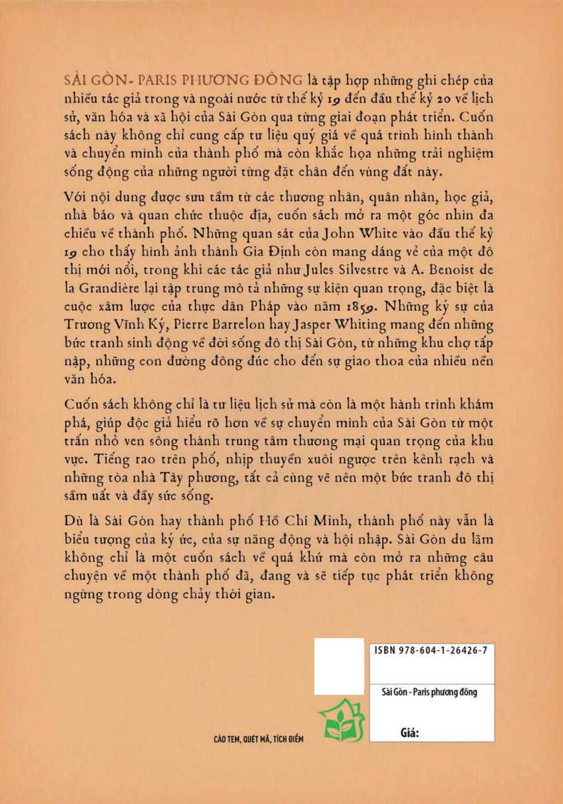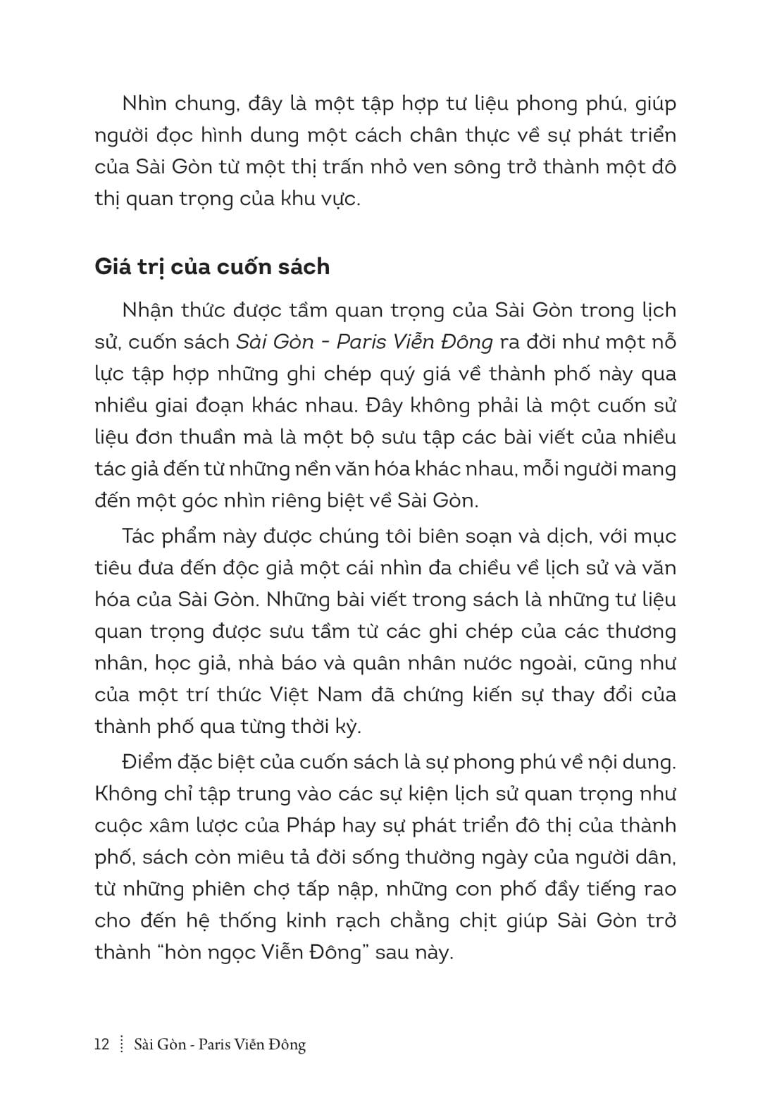 "Sài Gòn - Paris Viễn Đông" là tập hợp những ghi chép của nhiều tác giả trong và ngoài nước từ thế kỷ 19 đến đầu thế kỷ 20 về lịch sử, văn hóa và xã hội của Sài Gòn qua từng giai đoạn phát triển. Cuốn sách này không chỉ cung cấp tư liệu quý giá về quá trình hình thành và chuyển m.ình của thành phố mà còn khắc họa những trải nghiệm sống động của những người từng đặt chân đến vùng đất này.