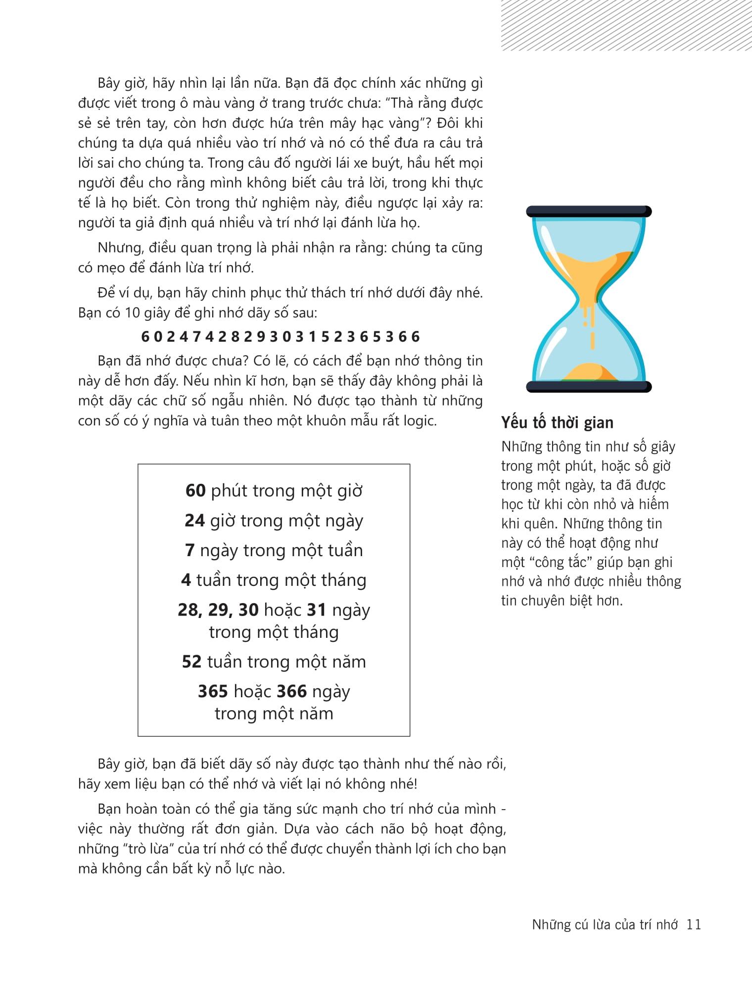 - Hiểu được trí nhớ của bản thân thay đổi như thế nào theo thời gian và bạn có thể làm gì để giữa cho tâm trí luôn khỏe mạnh khi về già Một cuốn sách dành cho mọi lứa tuổi, từ các bạn học sinh sinh viên muốn ghi nhớ kiến thức trên lớp, vượt qua kỳ thi,… cho đến các việc ứng dụng trí nhớ trong công việc hàng ngày, rèn luyện trí nhớ cả khi về già.