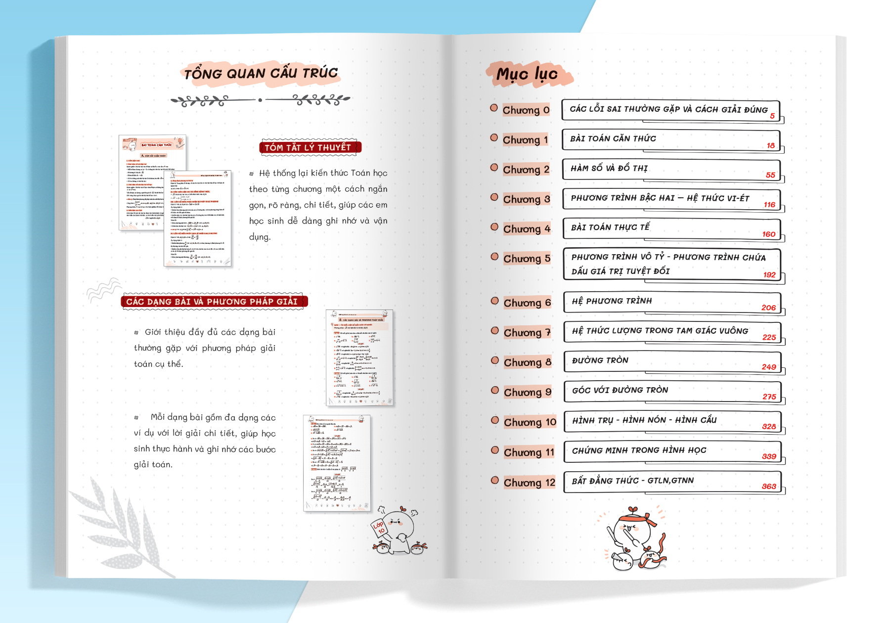 Cuốn sách bao gồm 12 chương kiến thức ngắn gọn nhất, trọng tâm nhất, chắc chắn xuất hiện 99% đề thi vào 10. Sổ tay đã được biên soạn và hệ thống hóa kiến thức toán học một cách tỉ mỉ và logic. Các chương sách được xây dựng một cách ngắn gọn, rõ ràng và chi tiết, giúp bạn nắm bắt và hiểu rõ từng khái niệm và các kiến thức cần nhớ.