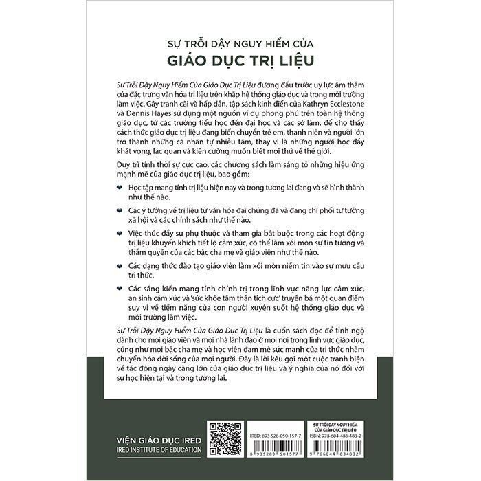 Sự Trỗi Dậy Nguy Hiểm Của Giáo Dục Trị Liệu đương đầu trước uy lực âm thầm của đặc trưng văn hóa trị liệu trên khắp hệ thống giáo dục và trong môi trường làm việc. Gây tranh cãi và hấp dẫn, tập sách kinh điển của Kathryn Ecclestone và Dennis Hayes sử dụng một nguồn ví dụ phong phú trên toàn hệ thống giáo dục, từ các trường tiểu học đến đại học và các sở làm, để cho thấy cách thức giáo dục trị liệu đang biến chuyển trẻ em, thanh niên và người lớn trở thành những cá nhân tự nhiễu tâm, thay vì là những người học đầy khát vọng, lạc quan và kiên cường muốn biết mọi thứ về thế giới.