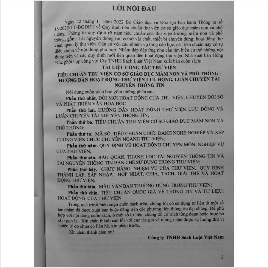 - Toàn bộ sách bìa mềm khổ lớn 19 x 27 cm phân phối bởi Nhà sách Nam Việt đều được bọc sách Plastic MIỄN PHÍ và xuất hóa đơn điện tử đầy đủ, nhanh chóng. …/… Lời giới thiệu: Ngày 22 tháng 11 năm 2022 Bộ Giáo dục và Đào tạo ban hành Thông tư số 16/2022/TT-BGDĐT về Quy định tiêu chuẩn thư viện cơ sở giáo dục mầm non và phổ thông. Thông tư quy định rõ năm tiêu chuẩn của mầm non và phổ thông, gồm: Tài nguyên thông tin, cơ sở vật chất, thiết bị chuyên dùng, hoạt động thư viện, quản lý thư viện. Căn cứ yêu cầu nhiệm vụ từng cấp học, các tiêu chuẩn này có sự điều chỉnh về nội dung phù hợp. Nhằm đáp đáp ứng nhu cầu tìm hiểu cụ thể những nội dung trên và các quy định mới liên quan đến hoạt động thư viện. Nhà sách Nam Việt xin trân trọng giới thiệu cuốn sách: Tài Liệu Công Tác Thư Viện - Tiêu Chuẩn Thư Viện Cơ Sở Giáo Dục Mầm Non Và Phổ Thông - Hướng Dẫn Hoạt Động Thư Viện Lưu Động, Luân Chuyển Tài Nguyên Thông Tin …/… Nội dung sách gồm 9 phần sau: Phần thứ nhất. Đổi mới hoạt động của thư viện, chuyển đổi số và phát triển văn hóa đọc Phần thứ hai. Hướng dẫn hoạt động thư viện lưu động và luân chuyển tài nguyên thông tin Phần thứ ba. Tiêu chuẩn thư viện cơ sở giáo dục mầm non và phổ thông Phần thứ tư. Mã số, tiêu chuẩn chức danh nghề nghiệp và xếp lương viên chức chuyên ngành thư viện Phần thứ năm. Quy định về hoạt động chuyên môn, nghiệp vụ của thư viện Phần thứ sáu. Bảo quản, thanh lọc tài nguyên thông tin và tài nguyên thông tin hạn chế sử dụng trong thư viện Phần thứ bảy. Chỉ dẫn áp dụng Luật Thư viện Phần thứ tám. Mẫu văn bản thường dùng trong thư viện Phần thứ chín. Tiêu chuẩn quốc gia về thông tin và tư liệu – thống kê, giao dịch mượn liên thư viện .../... Cảm ơn các bạn đã ghé thăm shop Nhà sách Nam Việt ! Sách Tài Liệu Công Tác Thư Viện - Tiêu Chuẩn Thư Viện Cơ Sở Giáo Dục Mầm Non Và Phổ Thông - Hướng Dẫn Hoạt Động Thư Viện Lưu Động, Luân Chuyển Tài Nguyên Thông Tin Sách Tài Liệu Công Tác Thư Viện - Tiêu Chuẩn Thư Viện Cơ Sở Giáo Dục Mầm Non Và Phổ Thông - Hướng Dẫn Hoạt Động Thư Viện Lưu Động, Luân Chuyển Tài Nguyên Thông Tin