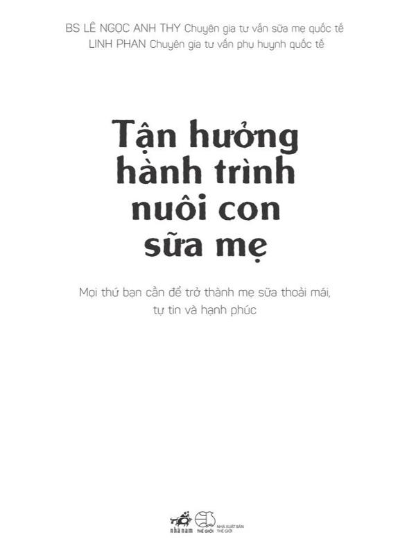 Mua tại TiktokKích thước: 14.5x20,5 cm Giới thiệu sách “Như một lẽ tự nhiên và như bản năng, các loài động vật có vú khi sinh ra đã có sữa mẹ của chúng để bú trong những tháng sơ sinh trước khi chúng biết ăn. Loài người không phải là ngoại lệ. Tuy nhiên, do nhiều lý do như tâm lý hay bệnh lý của bà mẹ, sự quảng cáo (đôi khi không đúng sự thật) của nhiều hãng sữa, hay do nhiều nguồn thông tin sai lệch, mà nhiều bà mẹ ở Việt Nam đang rất hoang mang khi cho bé bú mẹ. Với tâm huyết và kinh nghiệm của nhiều năm tư vấn cho các bà mẹ nuôi con bằng sữa mẹ, bác sĩ Anh Thy đã đúc kết những kiến thức quý báu về sữa mẹ để cho ra đời cuốn sách Tận hưởng hành trình nuôi con bằng sữa mẹ. Với văn phong gần gũi và dễ hiểu, cuốn sách này sẽ là hành trang không thể thiếu của bà mẹ trong việc mang lại cho bé yêu nguồn dinh dưỡng quý giá nhất trong những năm tháng đầu đời của bé, giúp bà mẹ tự tin thực hiện thiên chức của mình trong hành trình nuôi con bằng sữa mẹ.” BS Nguyễn Trí Đoàn, Trưởng khoa Nhi phòng khám quốc tế Victoria Healthcare, tác giả cuốn Để con được ốm “Sữa mẹ đối với nhiều người rất dễ dàng có được, cho con bú mẹ thật đơn giản, nhưng cũng có người còn khó khăn, còn hoài nghi khi cho con bú sữa mẹ. Cuốn sách này sẽ cung cấp cho mọi người những kiến thức cơ bản về vai trò của sữa mẹ cũng như những tình huống khó khăn đối với những người mẹ khó thực hiện khi nuôi con bằng sữa mẹ.” BS Trương Hữu Khanh, nguyên Trưởng khoa Nhiễm – Thần kinh, Bệnh viện Nhi Đồng 1 TP. HCM, tác giả cuốn Hỏi bác sĩ nhi đồng Tác giả BS Lê Ngọc Anh Thy đã có hơn 10 năm kinh nghiệm hỗ trợ các mẹ sữa, từng là bác sĩ gây mê hồi sức tại các bệnh viện lớn ở TP. HCM. Năm 2010, chị sinh bé trai và nuôi bé bằng sữa mẹ. Chị bén duyên với nghề tư vấn sữa mẹ khi được người bạn cũ mời chia sẻ trên group Nuôi con bằng sữa mẹ trên mạng xã hội. Sau đó, BS Anh Thy học chuyên sâu về sữa mẹ trong 2 năm và trở thành người đầu tiên tại Việt Nam lấy được chứng nhận Chuyên gia tư vấn sữa mẹ quốc tế IBCLC (Internal Board Certified Lactation Consultant) năm 2015. Cuối 2019, BS Anh Thy đến Trung tâm sữa mẹ quốc tế tại Toronto, Canada để học thêm nhiều kinh nghiệm thực tế. Linh Phan theo học lĩnh vực tâm lý học phát triển/tâm lý trẻ em và đang là thành viên của Hiệp hội Trị liệu Tâm thần dành cho gia đình tại Na Uy. Linh cũng đồng thời là một huấn luyện viên phụ huynh chuyên nghiệp (Certified Parent Coach) và là một tác giả sách. Linh hiện đang sống và làm việc cùng gia đình với hai con trai tại Na Uy.