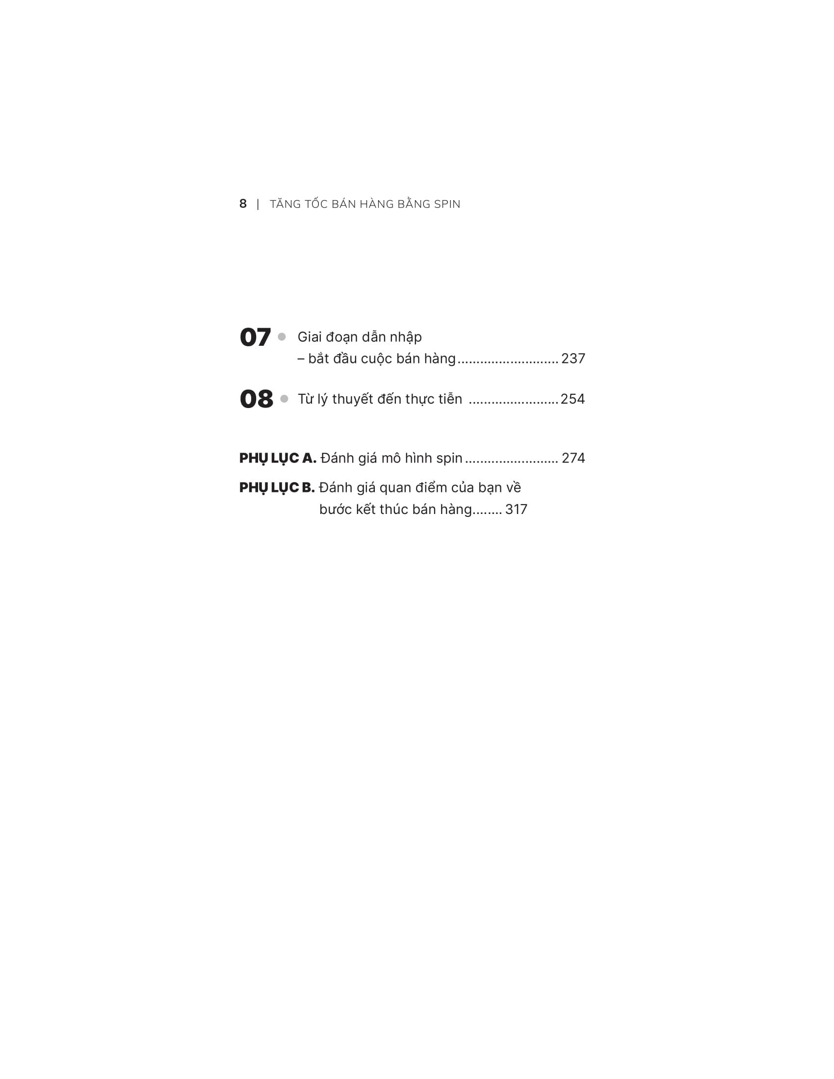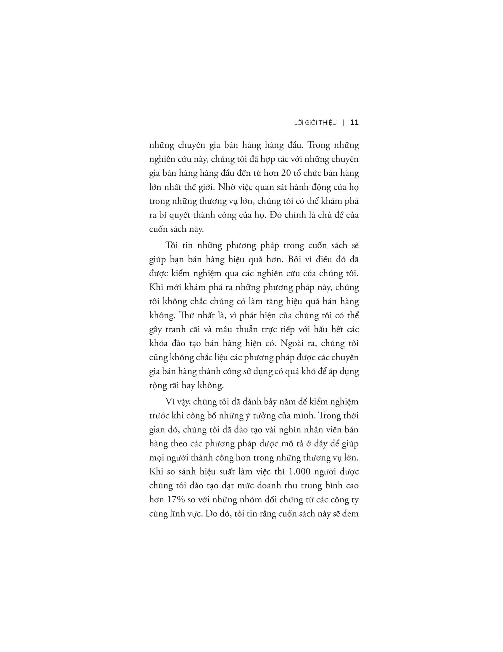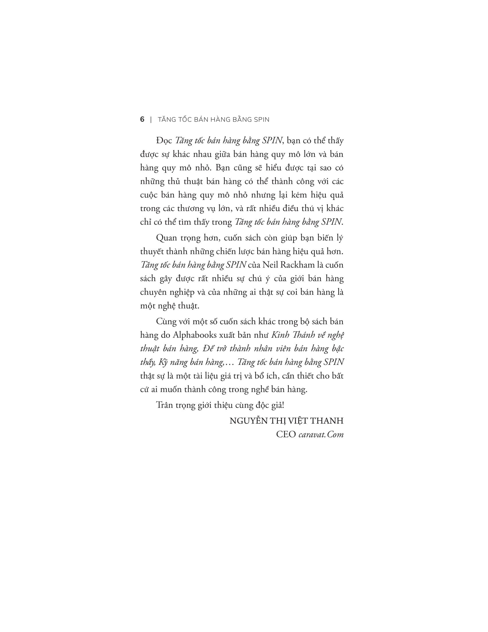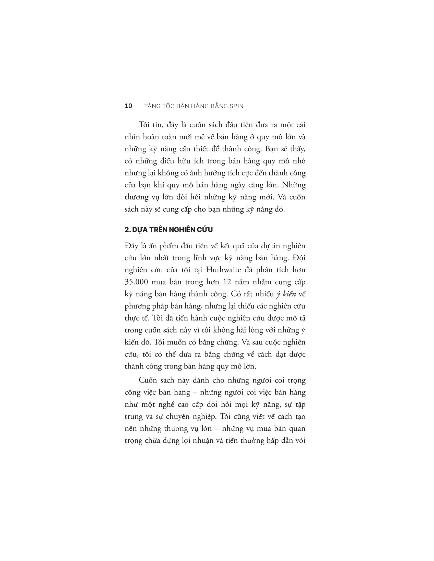 Đọc Tăng tốc bán hàng bằng SPIN, bạn có thể thấy được sự khác nhau giữa bán hàng quy mô lớn và bán hàng quy mô nhỏ. Bạn cũng sẽ hiểu được tại sao có những thủ thuật bán hàng có thể thành công với các cuộc bán hàng quy mô nhỏ nhưng lại kém hiệu quả với các cuộc bán hàng quy mô lớn và rất, rất nhiều điều thú vị khác chỉ có thể tìm thấy trong Tăng tốc bán hàng bằng SPIN.