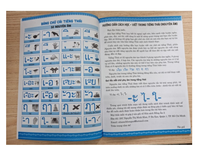 Khi học tiếng Thái hay bất kì ngoại ngữ nào, bên cạnh việc luyện nghe, phát âm, đọc, nói thì viết cũng là một kĩ năng quan trọng mà bạn cần luyện tập. Bởi nó không chỉ giúp bạn ghi nhớ các chữ cái mà còn cho bạn sự tự tin để trình bày các văn bản tiếng Thái một cách thành thạo. Cuốn sách này hướng dẫn bạn luyện viết các chữ cái tiếng Thái, phần Nguyên âm. Mỗi nguyên âm được trình bày cụ thể các nguyên tắc viết cũng như thứ tự viết từng nguyên âm để người học dễ theo dõi và tập viết các nét đúng, đều và đẹp. Tiếng Thái có 32 nguyên âm tạo thành 9 giọng nguyên âm ngắn, 9 giọng nguyên âm dài, 3 hợp âm. Các nguyên âm kép là những nguyên âm có 2 ký tự trở lên, những nguyên âm này có thể ở hai bên của phụ âm. Trong tiếng Thái có 6 nguyên âm ít thường dùng trong tiếng Thái hiện nay.