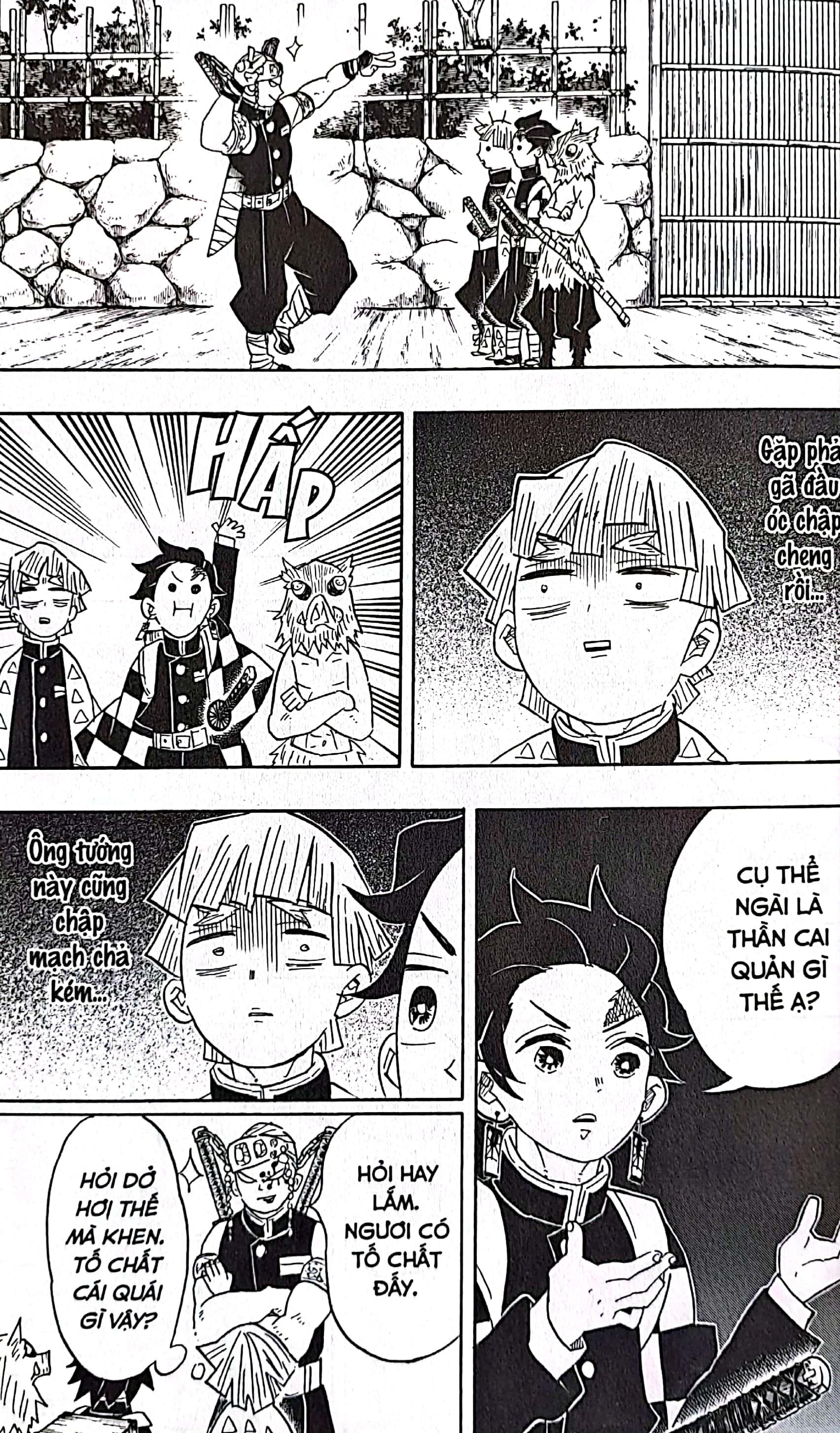 “Xin chào, tôi là Gotouge đây. Tập 9 đã ra lò rồi nè. Cảm ơn tất cả các bạn - những người đã ủng hộ và giúp đỡ tôi rất nhiều. Truyện mà không được đọc đến thì cũng chỉ là giấy mà thôi, vậy nên thật vinh dự cho tôi khi có ai đó cầm quyển truyện lên và đọc nó. Xin được nổ tràng p.háo tay để chúc phúc cho các bạn. Tôi cầu chúc cho những người đang ủng hộ một tác giả sắp tháo kính thật nhiều may mắn!!” - Koyoharu Gotouge