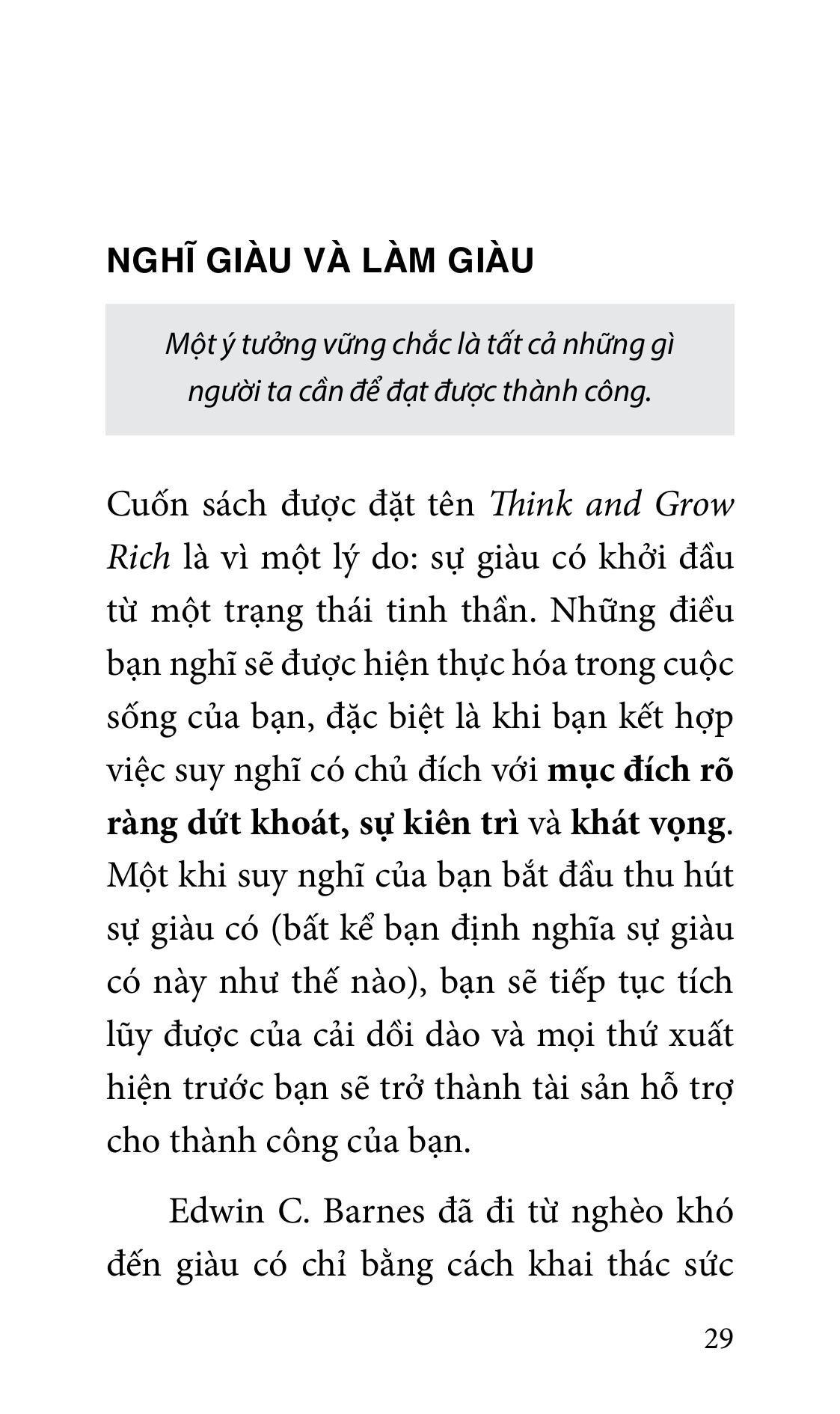 Think and Grow Rich không phải là cuốn sách bạn đọc một lần rồi đặt sang một bên. Đây là cuốn sách bạn đọc đi đọc lại tuần này qua tuần khác, tháng này qua tháng khác, năm này qua năm khác để nâng cao ý thức về thành công và tối đa hóa khả năng biến mục tiêu chính rõ ràng dứt khoát của m.ình thành hiện thực. Những doanh nhân vĩ đại nhất thế giới sẽ cho bạn biết rằng họ nghiền ngẫm lại các nguyên tắc trong cuốn sách của Hill ít nhất một lần mỗi năm để đảm bảo các ý tưởng luôn mới mẻ trong tâm trí họ.