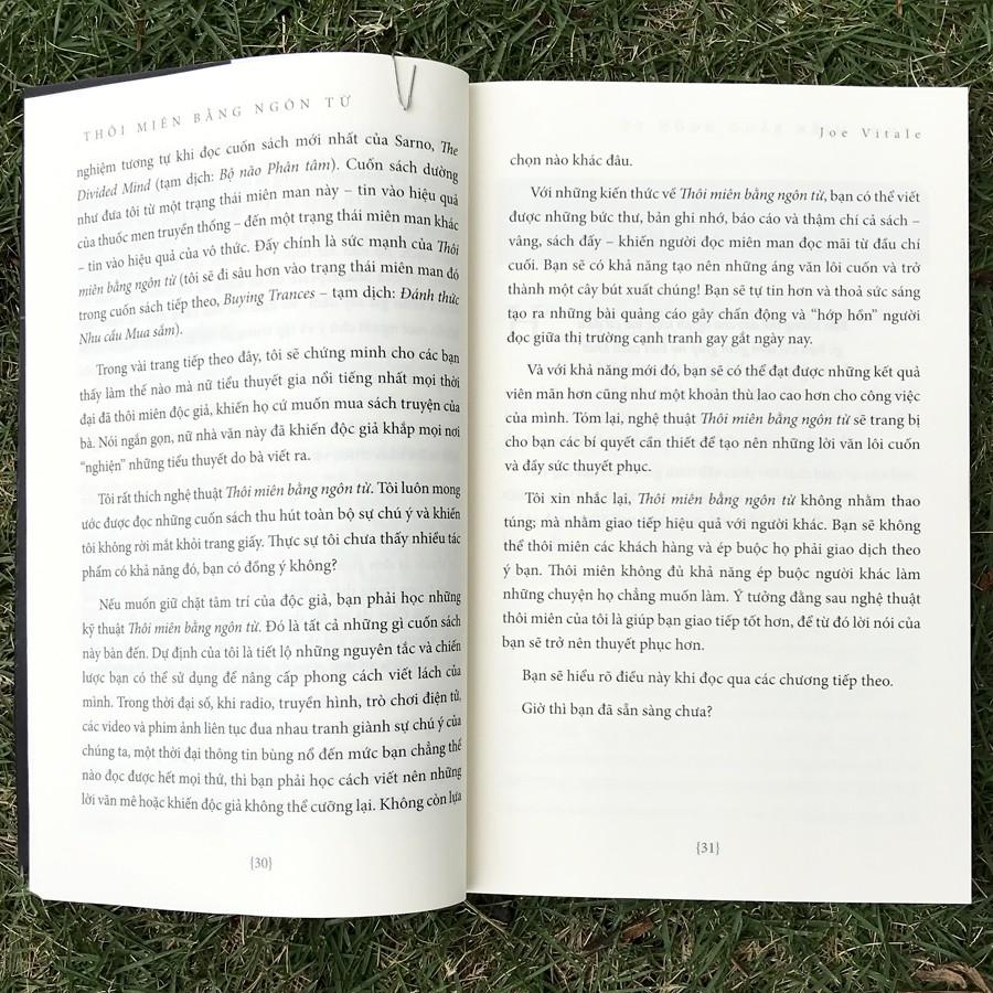 Mua tại TiktokThôi miên bằng ngôn từ (Bìa đen) Chắc hẳn bạn sẽ không muốn độc giả chìm vào giấc ngủ và tôi cũng vậy. “Thôi miên bằng ngôn từ”, theo tôi, là bất cứ cách viết lách nào khiến người đọc không thể cưỡng lại mà cứ đọc, đọc nữa, đọc mãi. Những câu chữ khiến mắt bạn dán chặt vào trang sách. Ngôn từ mạch lạc, súc tích, và hiệu quả, lôi cuốn bạn đọc hết từng từ, từng chữ một. Và hơn thế nữa, Thôi miên bằng ngôn từ khiến bạn phải ghi nhớ – và hành động – theo những gì bạn đã đọc.
