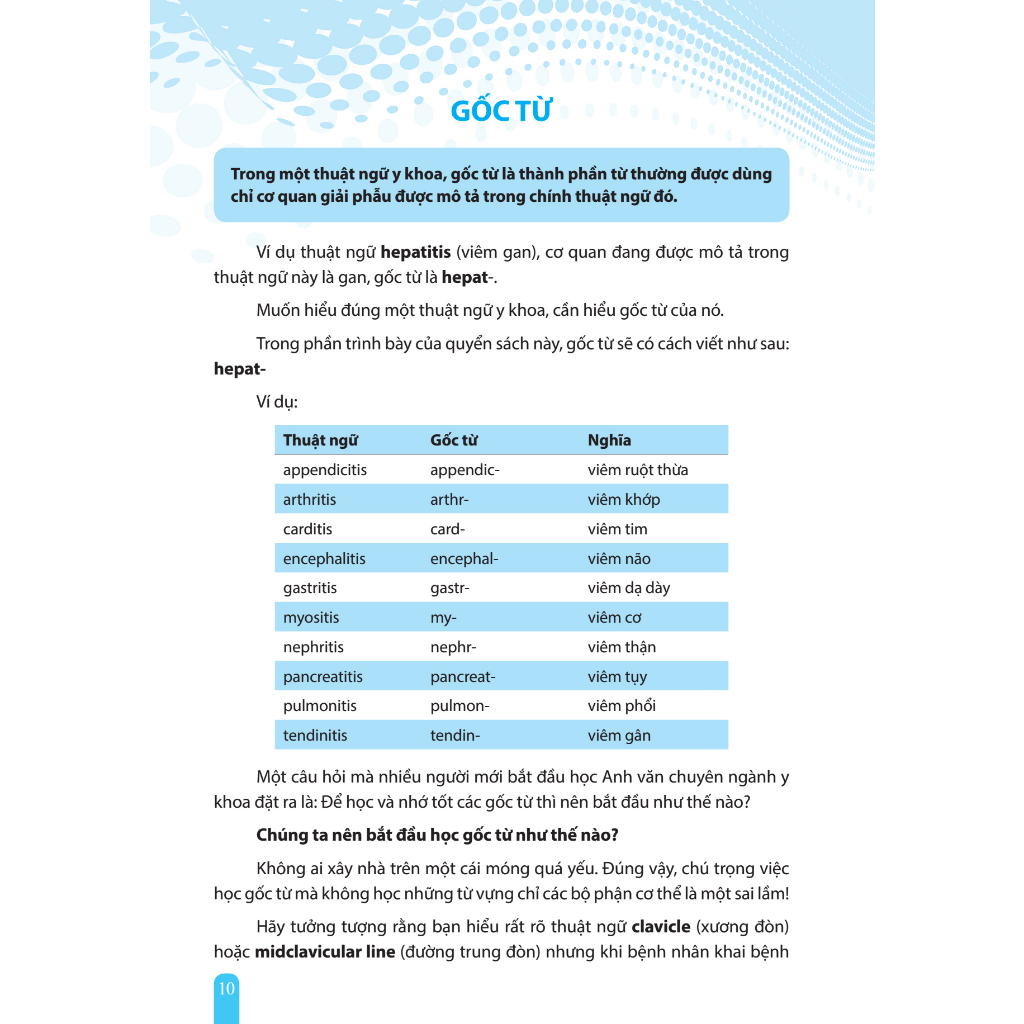 Thuật ngữ tiếng Anh chuyên ngành y khoa - Cho người mới bắt đầu hướng dẫn phương pháp thuật ngữ tiếng Anh y khoa và thuật ngữ y khoa các hệ cơ quan. Đây là vốn từ vựng học thuật rất cần thiết cho mọi người đọc tài liệu y khoa. Đặc biệt trong sách có để xem nội dung video hướng dẫn tự học Ở chương 1 Thuật ngữ tiếng Anh y khoa cơ bản cung cấp bạn đọc cách tự học thuật ngữ y khoa một cách cơ bản nhất. Bao gồm: Cấu tạo thuật ngữ y khoa tiếng anh Cách phiên âm thuật ngữ tiếng Anh y khoa Phát âm thuật ngữ tiếng Anh y khoa…