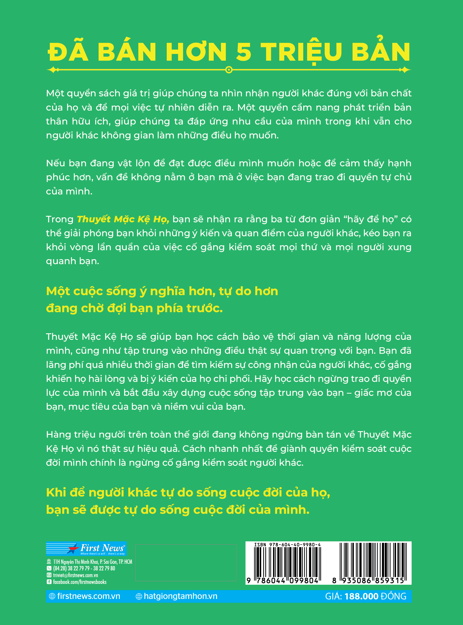 Nếu bạn từng cảm thấy quá tải, bị mắc kẹt hoặc thất vọng về vị trí hiện tại của mình, vấn đề không nằm ở bạn mà ở việc bạn đã trao quyền kiềm soát cho mình cho người khác. Ba từ đơn giản “hãy để họ” sẽ giải phóng bạn khỏi những ý kiến và quan điểm của người khác, khỏi vòng lẩn quẩn của việc cố gắng kiểm soát mọi thứ và mọi người xung quanh bạn.