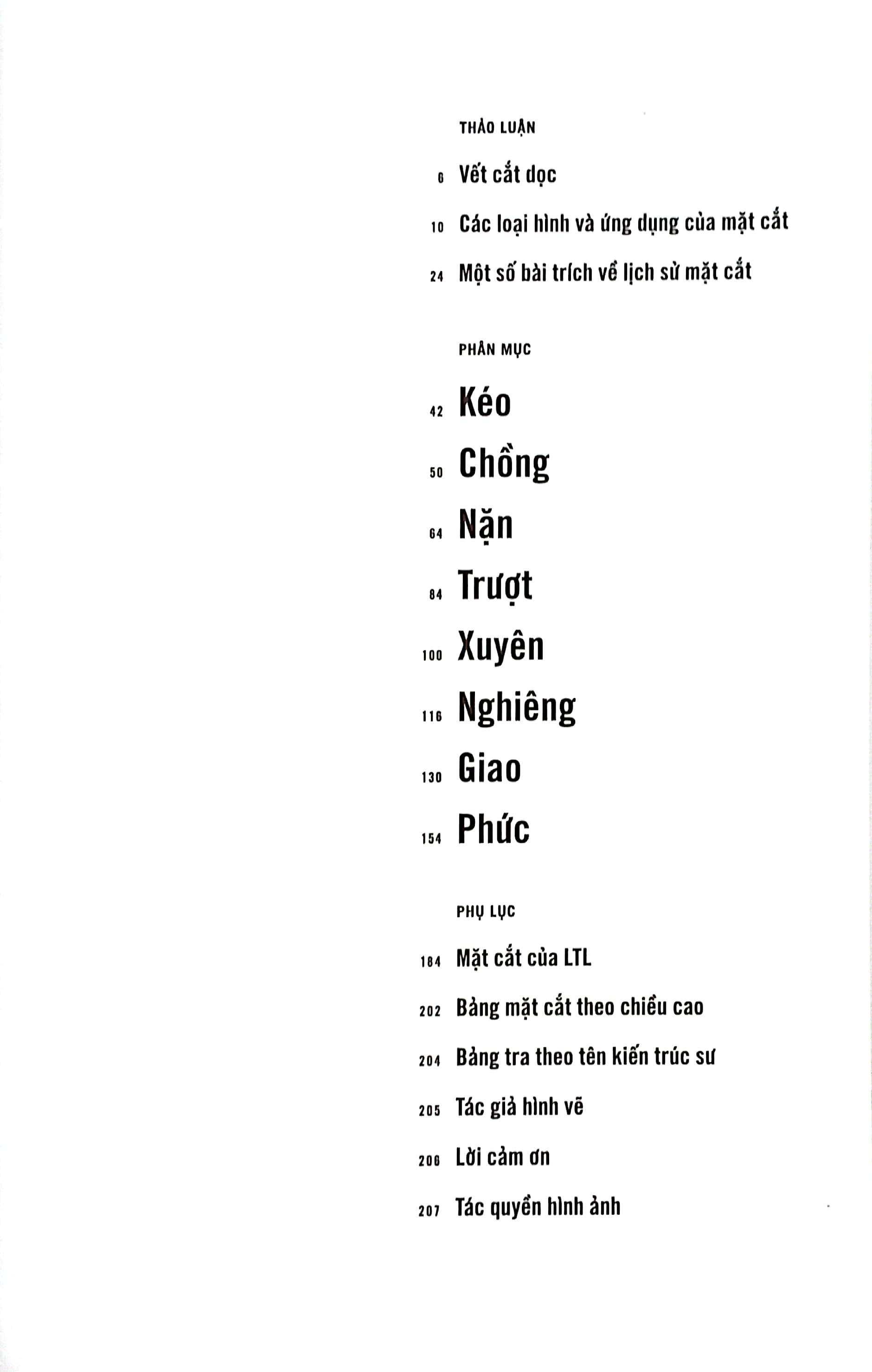 Quyển sách này được hệ thống theo một cách kích thích sự khám phá và tạo ra những thảo luận mở về mặt cắt. Sáu mươi ba mặt cắt phối cảnh đã được phân theo bảy nhóm riêng biệt, cung cấp cho sinh viên, kiến trúc sư, và các độc giả khác một góc nhìn tổng quan và toàn diện để có những nghiên cứu sâu hơn về mặt cắt.