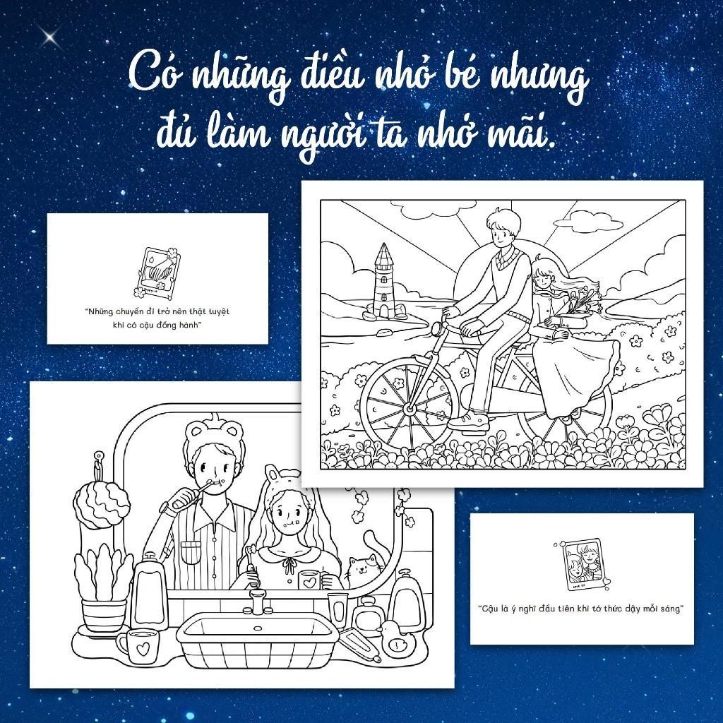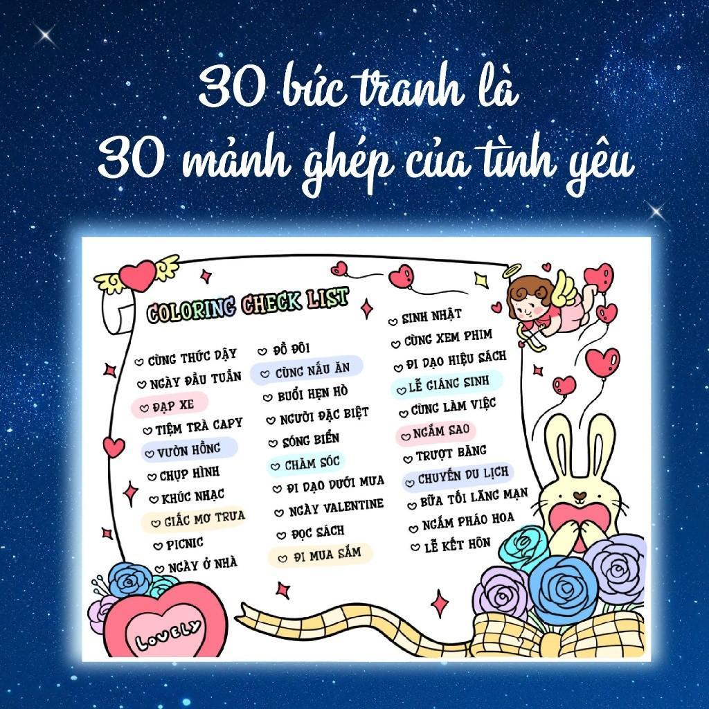 - Với 30 bức tranh tô màu, mỗi bức tranh là một mảnh ghép tình yêu, tạo nên hành trình cảm xúc qua từng nét tô.
