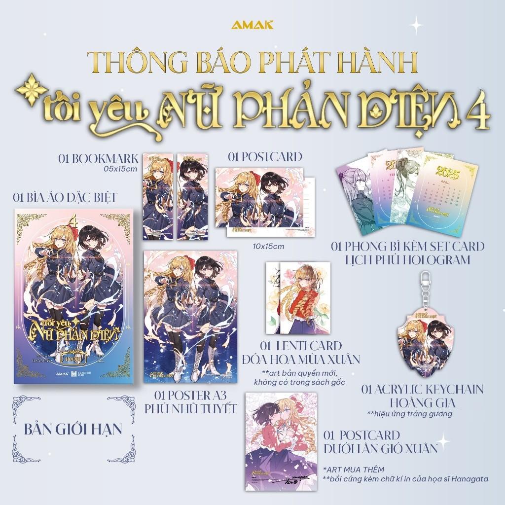 Bản giới hạn: 01 bìa áo rời đặc biệt, 01 bookmark hai mặt, 01 postcard hai mặt, 01 poster A3 phủ nhũ tuyết, phong bì kèm set postcard lịch Hologram 7 màu rực rỡ, 01 Lenti Card ĐÓA HOA MÙA XUÂN, 01 postcard DƯỚI LÀN GIÓ XUÂN với tranh mua thêm kèm chữ kí in của họa sĩ Hanagata (kích cỡ 13x18cm, bồi cứng), 01 Acrylic Keychain HOÀNG GIA (mặt trước phủ epoxy, mặt sau tráng gương). Giá: 355.000vnd