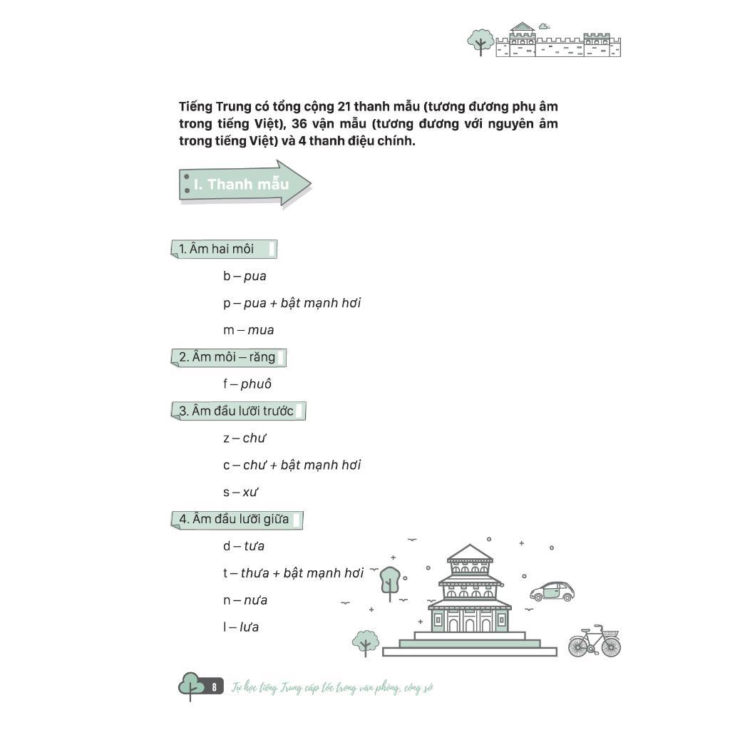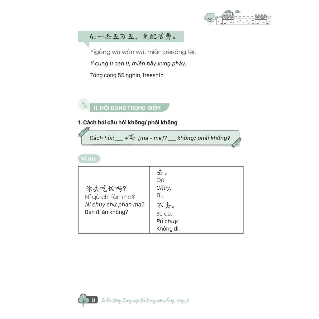 - Bạn là chủ doanh nghiệp đang muốn kịp thời trang bị giao tiếp cơ bản để tiếp đón khách Trung Quốc? Cuốn sách "Tự học tiếng Trung cấp tốc trong văn phòng, công sở" chính là cuốn cẩm nang mà nhất định bạn phải có. Cuốn sách cung cấp các mẫu câu giao tiếp theo chủ đề đa dạng bao gồm phần chữ Hán, phiên âm chuẩn quốc tế, phần âm mô phòng bằng tiếng Việt và phần dịch nghĩa. Đồng thời cuốn sách còn có các công thức ngắn gọn với giải thích dễ hiểu, và cung cấp hệ thống từ vựng theo chuyên ngành giúp người học có thể vận dụng kiến thức một cách linh hoạt trong công việc và cuộc sống. Ảnh bìa cuốn sách Tự học tiếng Trung cấp tốc trong văn phòng, công sở Nội dung cuốn sách Tự học tiếng Trung cấp tốc trong văn phòng, công sở