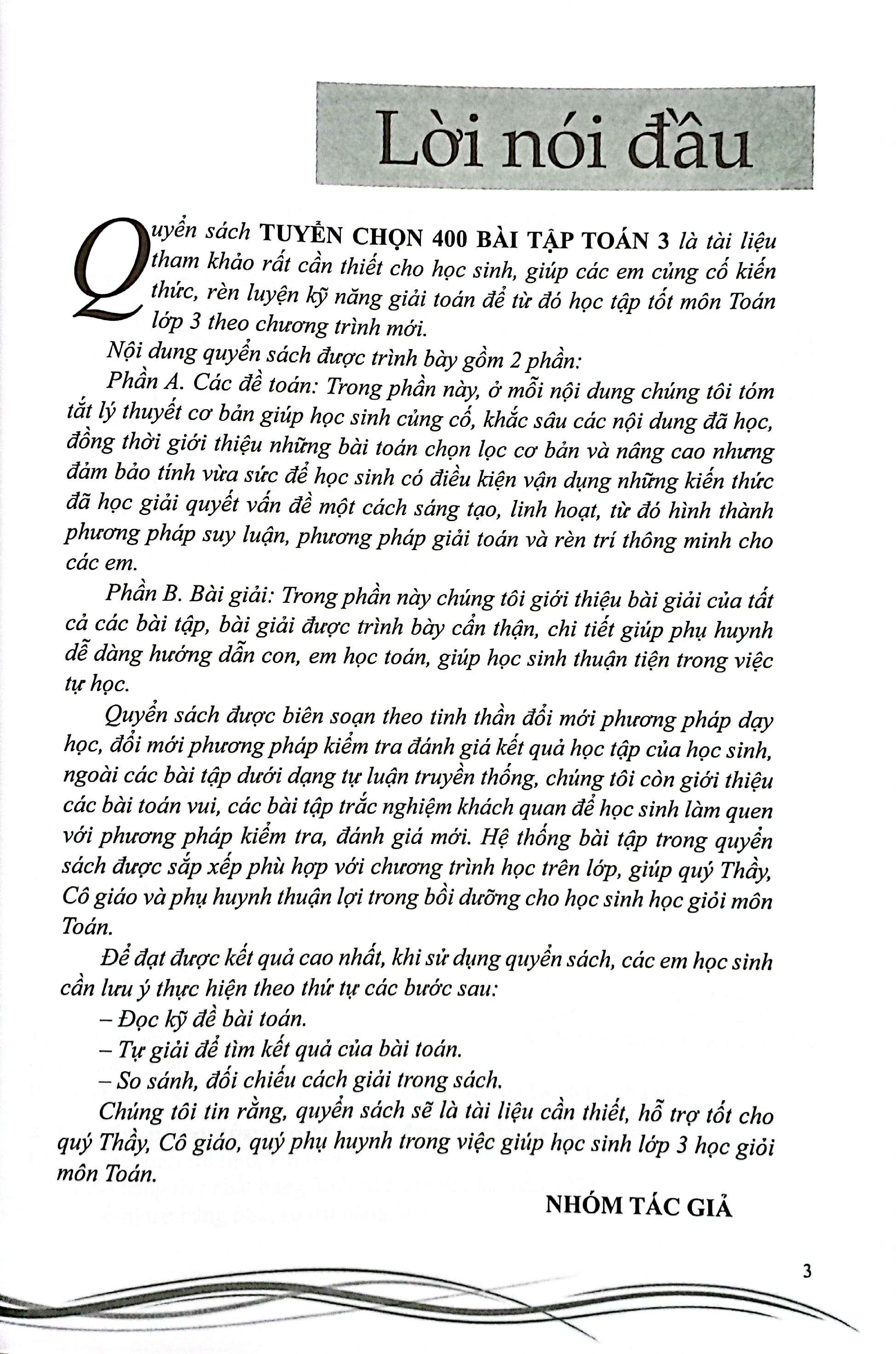 Quyển sách TUYỂN CHỌN 400 BÀI TẬP TOÁN 3 là tài liệu tham khảo rất cần thiết cho học sinh, giúp các em củng cố kiến thức, rèn luyện kỹ năng giải toán để từ đó học tập tốt môn Toán lớp 3 theo chương trình mới.