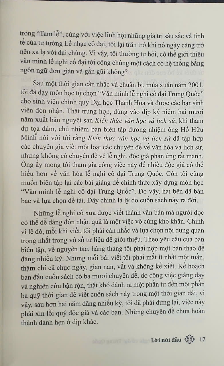 - Quá trình thực hiện công phu Tác giả tiết lộ những năm tháng biên soạn vất vả: từ việc giảng dạy tại Đại học Thanh Hóa, hợp tác với tạp chí Kiến thức văn học và lịch sử, đến việc chọn lọc nội dung lễ nghi để đưa ra một hệ thống đơn giản, gần gũi với độc giả phổ thông – một công trình tâm huyết và trình độ cao. Văn minh lễ nghi cổ đại Trung Quốc không chỉ là một công trình nghiên cứu học thuật uyên bác mà còn là một hành trình phục hồi giá trị, gợi mở về khả năng đưa lễ nghi truyền thống trở nên dễ tiếp cận và có ý nghĩa thiết thực trong đời sống đương đại. Đây chắc chắn là một cuốn sách đáng đọc, không chỉ để hiểu lại quá khứ, mà còn để tái khẳng định bản sắc văn hóa trong tương lai